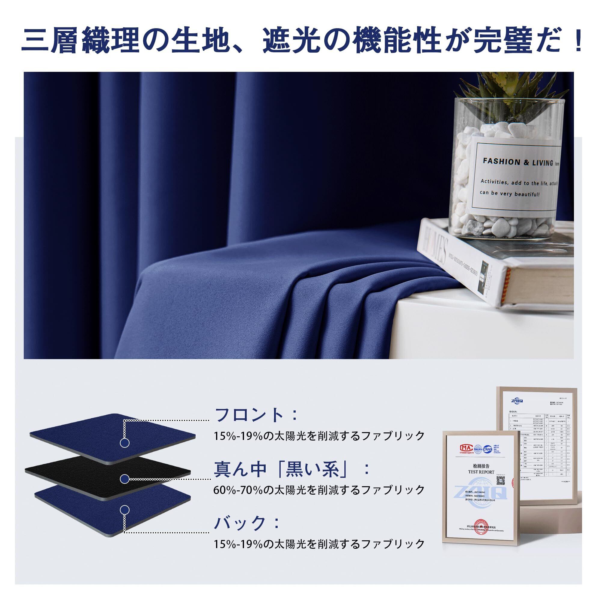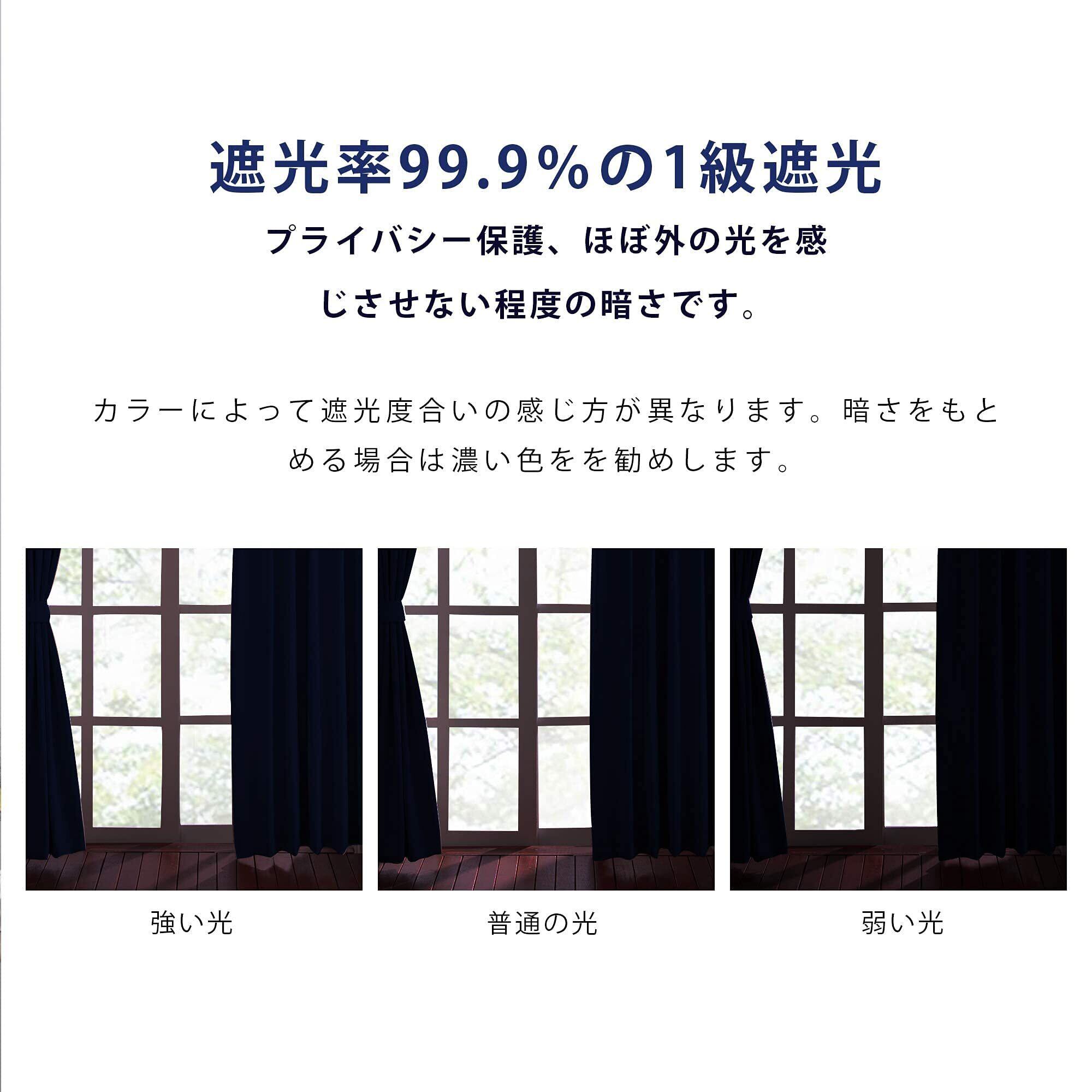【縫製/付属品】1.5倍ヒダ・ 2ッ山 ・形態安定加工。遮光カーテン2枚入り、共布タッセル2枚付き、アジャスターフック14本付き(予備フック2本)、高さ6cmまで、14段階調節可能です。100%ポリエステルより、耐久性がよい。厚地の生地が絹のような滑らか、輝いているさま光沢があります。