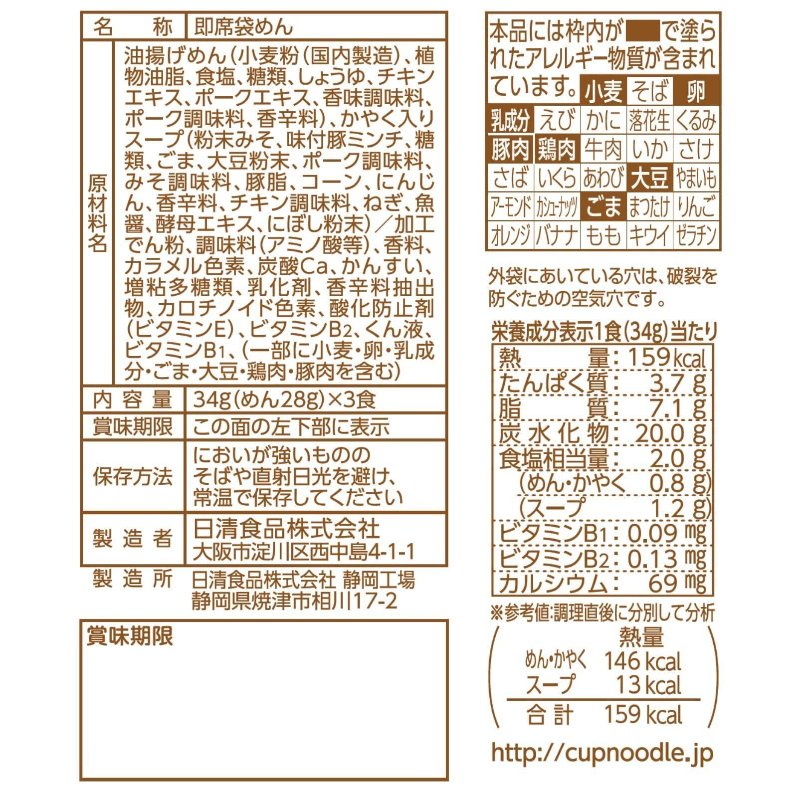 油揚げめん(小麦粉(国内製造)、植物油脂、食塩、糖類、しょうゆ、チキンエキス、ポークエキス、香味調味料、ポーク調味料、香辛料)、かやく入りスープ(粉末みそ、味付豚ミンチ、糖類、ごま、大豆粉末、ポーク調味料、みそ調味料、豚脂、コーン、にんじん、香辛料、チキン調味料、ねぎ、魚醤、酵母エキス、にぼし粉末)/加工でん粉、調味料(アミノ酸等)、香料、カラメル色素、炭酸Ca、かんすい、増粘多糖類、乳化剤、香辛料抽出物、カロチノイド色素、酸化防止剤(ビタミンE)、ビタミンB2、くん液、ビタミンB1、(一部に小麦・卵・乳成分・ごま・大豆・鶏肉・豚肉を含む)