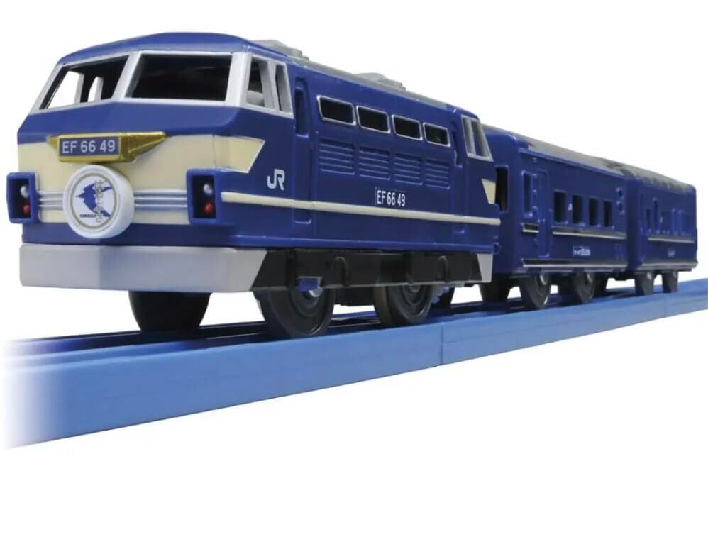 プラレール/ブルートレイン はやぶさ EF66 49限定車両 タカラトミー(プラレール博2012限定) 【ブルートレイン はやぶさ】 1958年に特急列車として運転開始、1960年〜1997年までは東京-西鹿児島間を、以降2009年までは、東京-熊本間を走った寝台特急です。 半世紀に渡り、東京発九州行きのブルートレインとして運行していましたが、2009年のダイヤ改正で引退となります。 使用電池:単2乾電池×1本(別売)