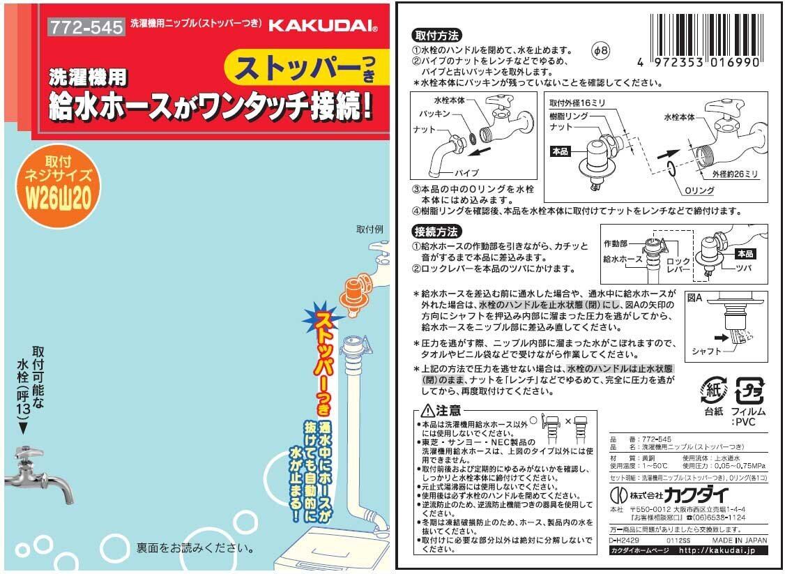 カクダイ 洗濯機用 水漏れ防止ストッパー付きニップル 呼13 万能ホーム水栓 対応 取替簡単 金属製 真下向き 772-545