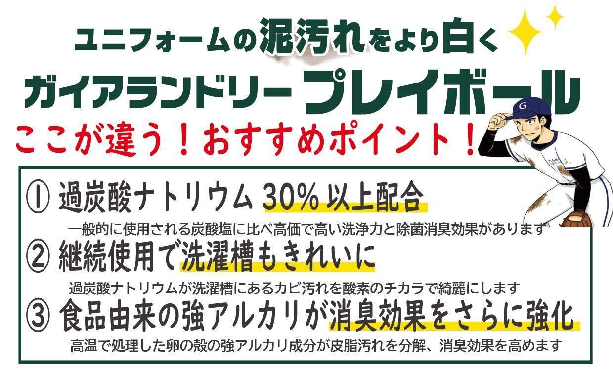 ユニフォームの泥汚れをより白く 泥汚れ・皮脂汚れ・汗ジミ・においをすっきり落とす泥汚れ専用洗剤の決定版! 今話題の過炭酸ナトリウムを主成分としており、つけ置きするだけで、しつこい泥汚れをスッキリ落とします。*つけ置きした際に”シュワシュワ”と酸素系漂白剤が泡立ち、泥汚れをより白く落とします。さらに過炭酸ナトリウムは除菌・消臭効果があり、酸素系の優しい漂白力もあるため、洗濯洗剤の救世主と言われています。継続して使用していくことで洗濯槽もキレイにしてくれます。製品化まで約3年をかけて、こだわりぬいた泥汚れ専用洗剤です。 ガイアランドリープレイボールは頑張る子ども達をユニフォームの白さで応援します。 ■成分:リン酸塩(P2O5として)17.4%、過炭酸ナトリウム、ポリオキシアルキレンアルキルエーテル(13%)、卵殻焼成カルシウム、蛍光増白剤 ■グリーンテクノ21について 私たち株式会社グリーンテクノ21はスポーツ用滑り止め材や学校用のグラウンド用白線、住宅用壁紙の開発・製造販売を行っております。 原料として、食品工場から排出される卵の殻をリサイクルし加工したものを使用しています。 これまでは多くが産業廃棄物として処理されていた卵殻をリサイクルすることにより出来る限り廃棄物を削減し、さらに「子どもたちにもわかりやすいリサイクル」を目指している会社です