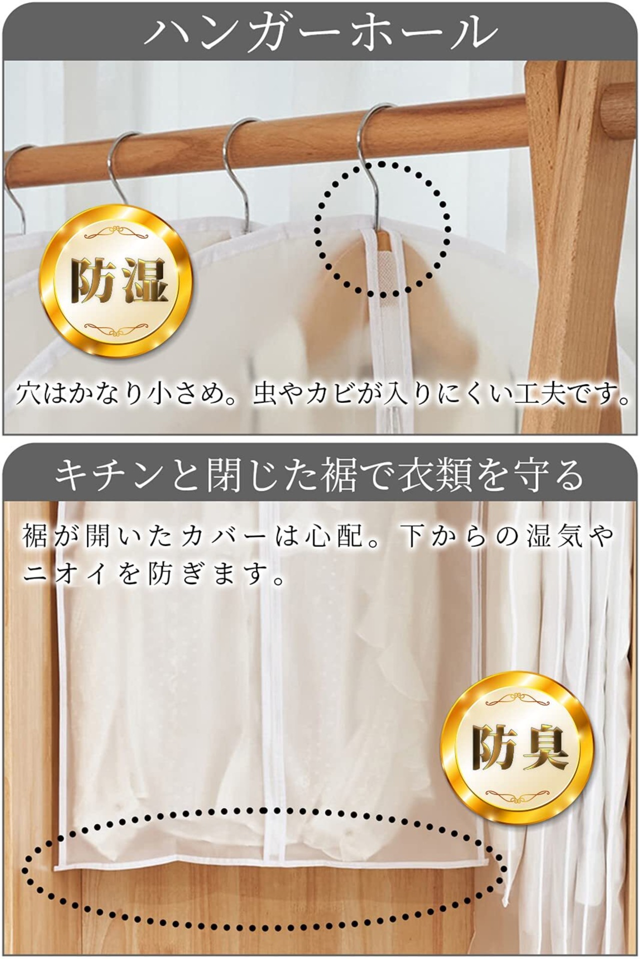 【■優れた防塵性能のPEVA材質】 ホコリや汚れをしっかり防ぐ防塵素材。ペットの毛や部屋のほこりから服を守ります。不織布カバーよりも防塵性能が高く、大切な衣類をきれいに保管できます。汚れの侵入を最小限に食い止めるため、ハンガー穴は小さめにし、底部分を縫い合わせました。