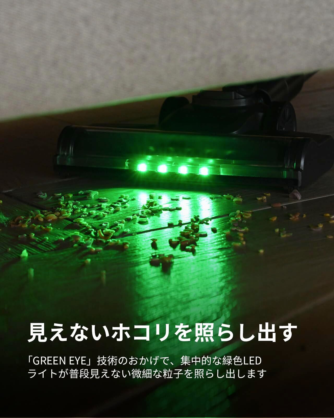 【革新的なLED緑ライトで、ホコリを見逃さない】このコードレス 掃除機は、革新的なLEDグリーンライト機能を搭載しており、暗い場所や家具の下に隠れたホコリを的確に照らし出し、清掃をより効率的かつ徹底的に行うことができます。隅々や隙間、低い家具の下など、緑色の光が微細なホコリや汚れをくっきりと映し出し、見逃しを防ぎます。肉眼では見つけにくい微小な粒子も、グリーンライトの照射によって簡単に発見でき、清掃の質を大幅に向上させます。昼間でも夜間でも、クリアな視界を提供し、清掃作業を効率的に進めることが可能です。さらに、グリーンライトの特殊な波長設計により、ホコリの反射効果が高まり、床の上の細かい粒子やペットの毛、カーペットの奥に詰まった汚れの除去に特に効果的です。この機能により、家中のあらゆる場所を徹底的に清掃し、清潔な環境を保つことができます。