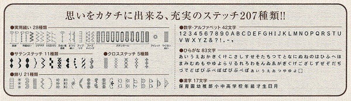 付属品ハードケース、フットコントローラー、ワイドテーブル、針#14×3本、ボビン×3、糸こま押さえ、立式糸立て棒、リッパー(ブラシ付き)、ドライバー(大小)、シームガイド、(裁ちめかがり・裾まつり・ファスナー・サテン・ボタン付け・ボタン穴かがり)各押さえ、取扱説明DVD付き