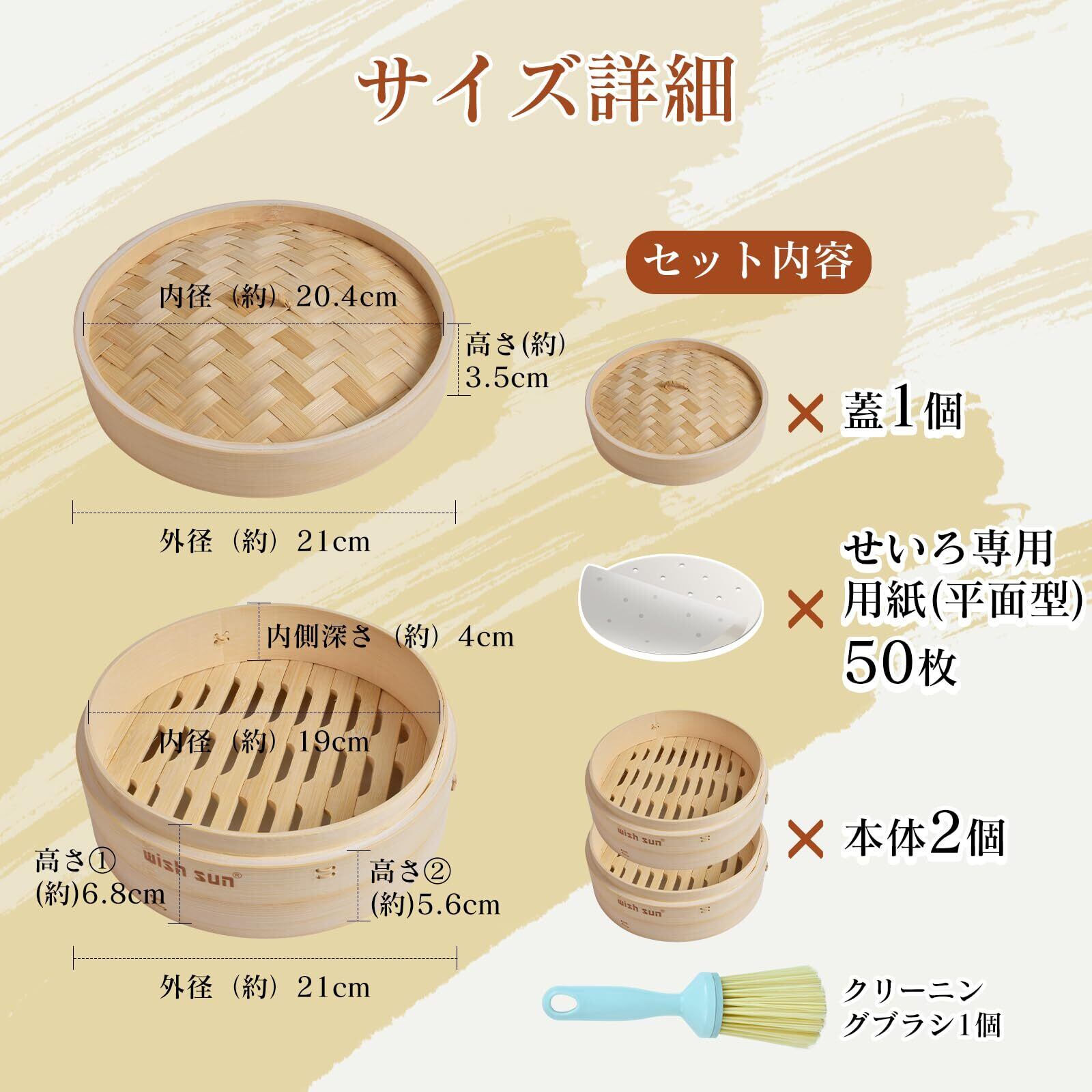 【蒸籠仕様】材質:天然竹;セット内容:蓋1個、本体(直径21cm)2個、蒸籠専用シート50枚;WISH SUN せいろは工場出荷前と発送前の2段階で検品チェックしておりますので安心してご使用いただけます。万が一、商品 WISH SUN せいろに問題がございましたら、どうぞご遠慮なくご連絡ください。