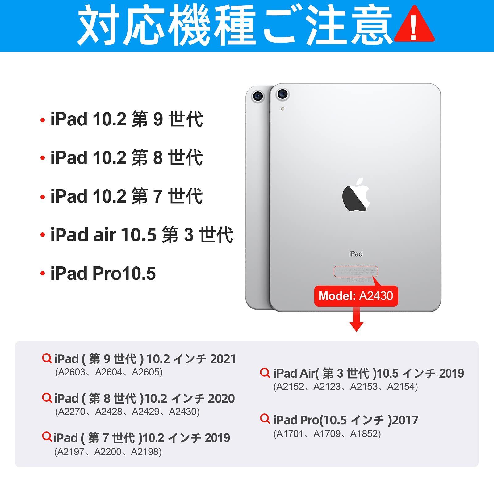 【対応機種】iPad 第9世代 10.2(2021年モデル:A2602、A2603、A2604、A2605)*iPad 第8世代 10.2(2020年モデル:A2270、A2428、A2429、A2430)*iPad 第7世代 10.2(2019年モデル:A2197、A2200、A2198) *iPad Air3 10.5(2019年モデル:A2152、A2123、A2153、A2154) *iPad Pro 10.5(2017年モデル:A1701、A1709、A1852)に対応しています。ご注文前にアイパッド裏面のモデルを確認ください。ご注意:本製品はiPadとApple pencilを含めません。