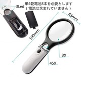 手持ち式のLED付き拡大鏡です。2種類の拡大率(大型レンズ3倍・小型レンズ45倍)のレンズ付きなので使い分けが可能です。※持ち手部分のサブレンズは焦点距離が短いので対象に近づけてご使用ください。離すと逆像になります。