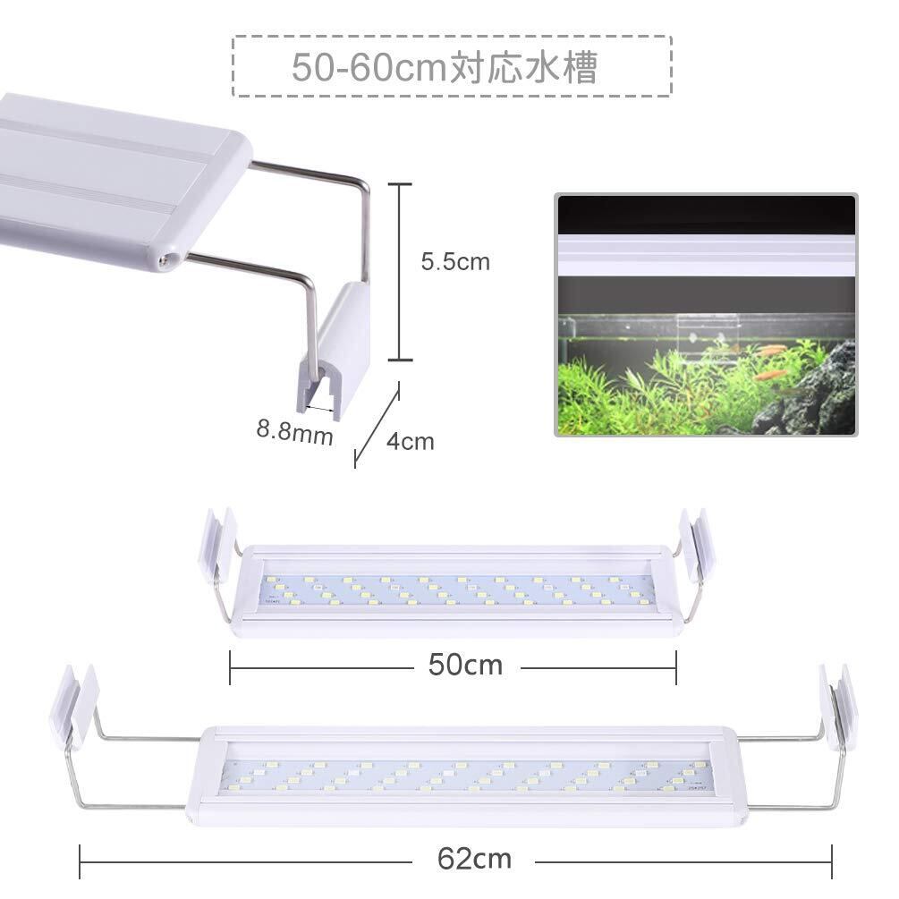 【調節可ブラケット】左右から各約6cmの伸縮式サイズ、水槽のサイズによって50~60cm(19.7-23.6インチ)調節可能、使いやすさ抜群で使い幅も広い、フレームレス水槽、枠付き水槽の両方に取り付けできます。
