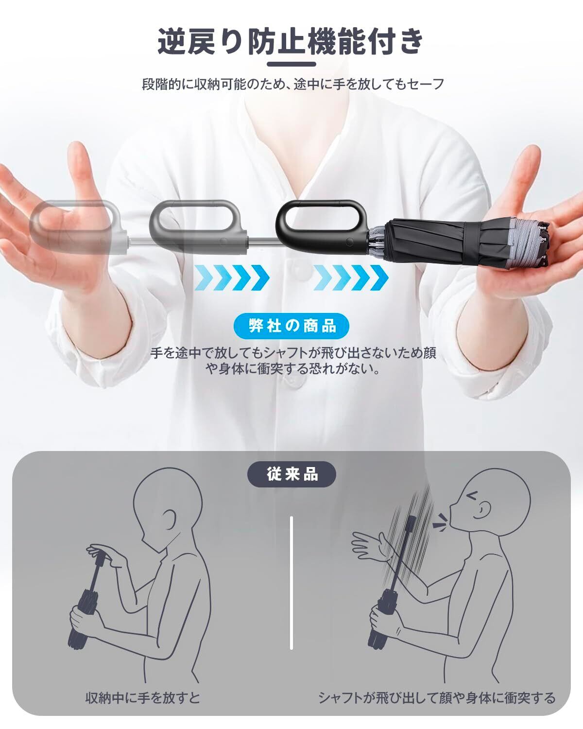 【安全設計で安心!逆戻り防止機能付き自動開閉傘】ジャンプ式折りたたみ傘の中には、手元を収納する際に手を離すと手元が飛び出し、顔や身体に衝突するという心配があります。しかし、DAZOPAGE自動開閉式傘には逆戻り防止装置が内蔵されています。そのため、手元を収納する途中で手を離しても、手元が飛び出すことなく安全に止まります。一般的な自動開閉折りたたみ傘よりも安全性が向上しており、両腕の力だけで仕舞うことができるため、男性はもちろん、女性やご年配の方でも操作しやすくなります。
