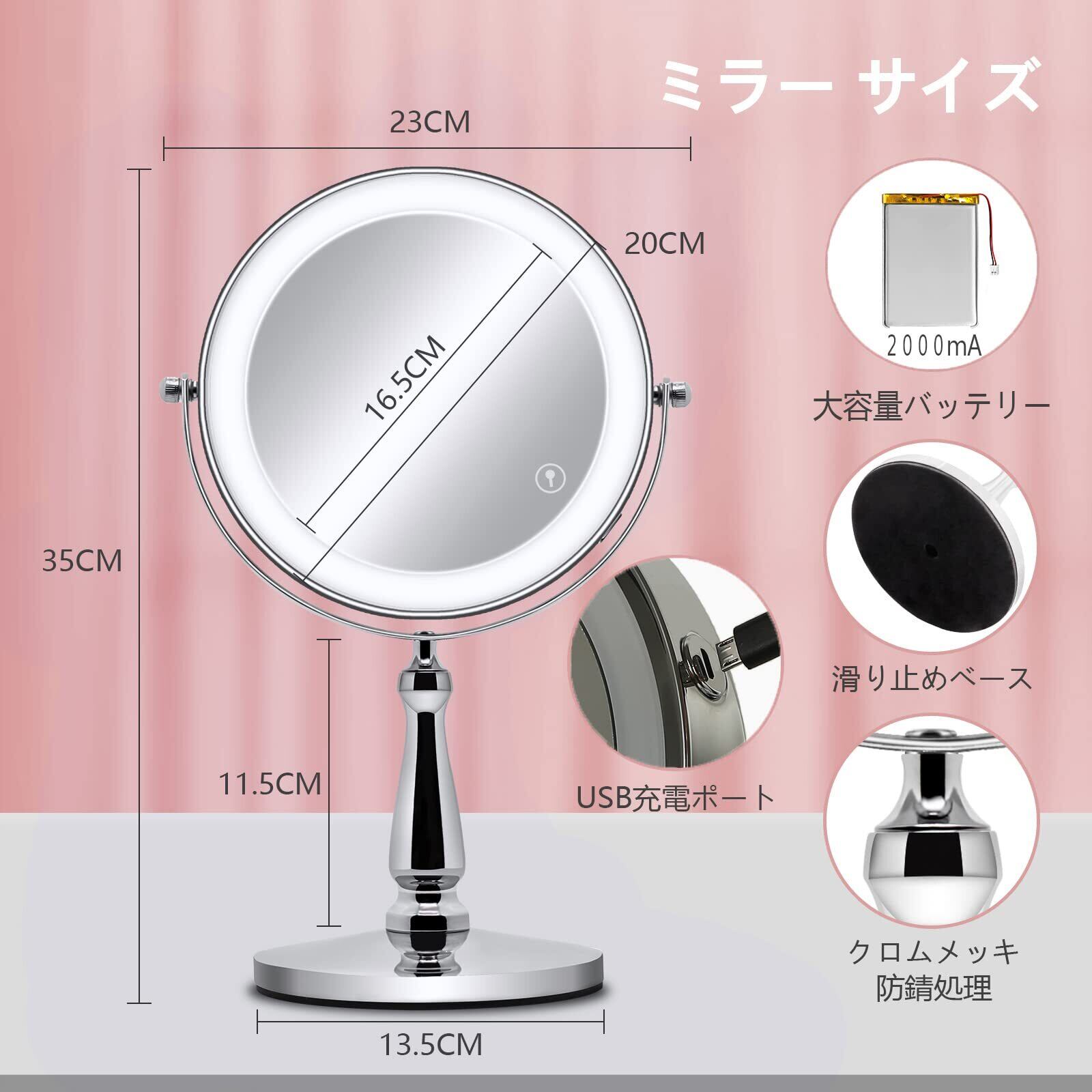 【高演色性】アジア人の肌色の演色指数に基づいて、特殊な高演色性のLEDライトを搭載しています。自然光を再現し、ジュエリー級の高演色性に至り、8インチ大きめの円型ミラーはお家でプロ級のメイクアップをお楽しみ頂けます。身づくろい、メイクアップ、スキンケアなどには最適です。