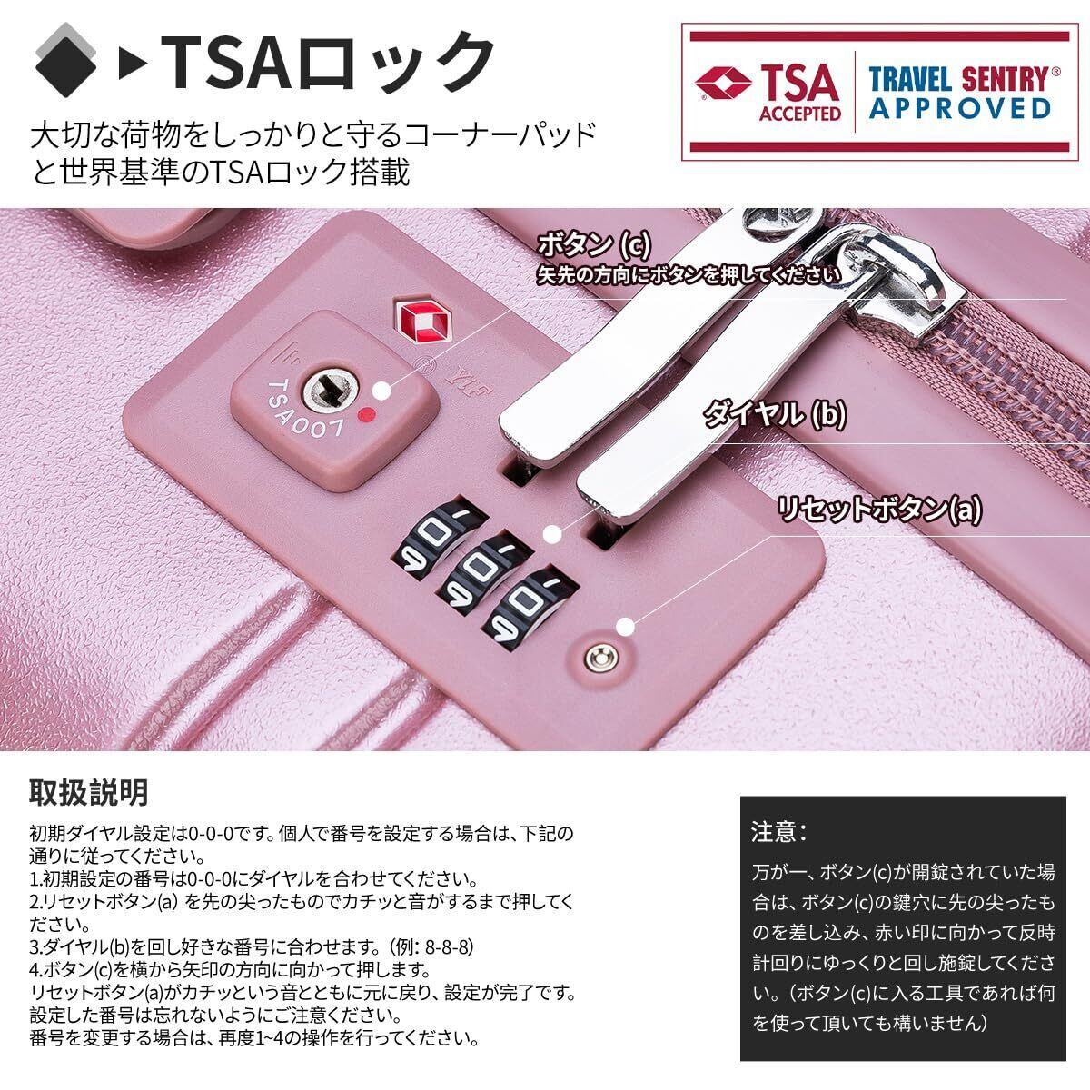 【三段調節キャリバー&YKKファスナー】超軽量のアルミニウム製キャリバー、高さ三段階調節、ご自分の身長に合わせてスムーズに調整が可能です。プルロッドは揺れを最小限に抑えるために一体型に設計されています。耐振性に優れるデザインで荷物を引きかける時、しっかりしています。また、日本が世界に誇るYKKファスナーをメインファスナーに標準装備。ファスナータイプのスーツケースによくあるファスナーの不具合(ファスナー脱線や開き)を解消し、長期にわたり安定した使用感が可能となりました。