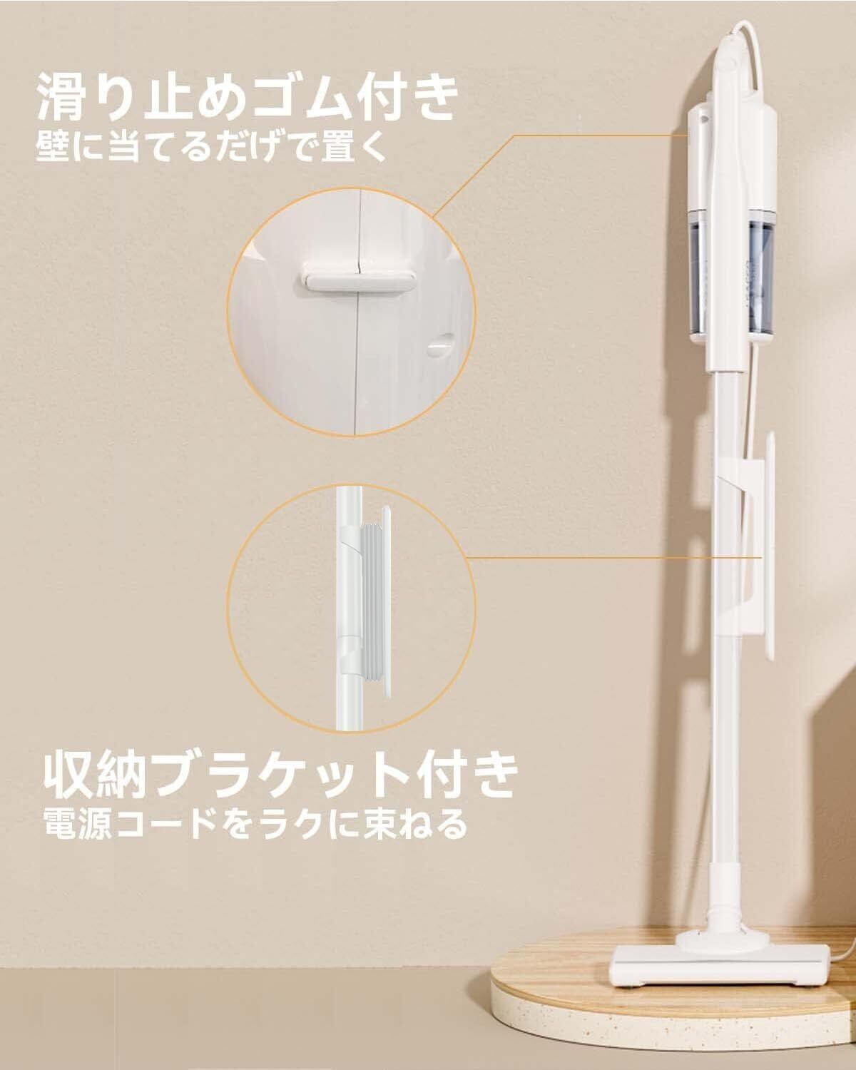 ✨【5mコード式掃除機】コード式だから、長時間使っても吸引力が落ちません。5mの電源コードで、メイン掃除機として部屋の隅々までのお掃除は十分です。充電不要なので気が向いたときにいつでも使用でき、時間の制限はありません。余ったコードは巻き取り収納が可能。滑り止めゴム付きまして、不使用とき、壁に立てかけることができます。※ご注意:毛足の長い絨毯や濡れたフローリングには対応できません。予めご了承下さい。