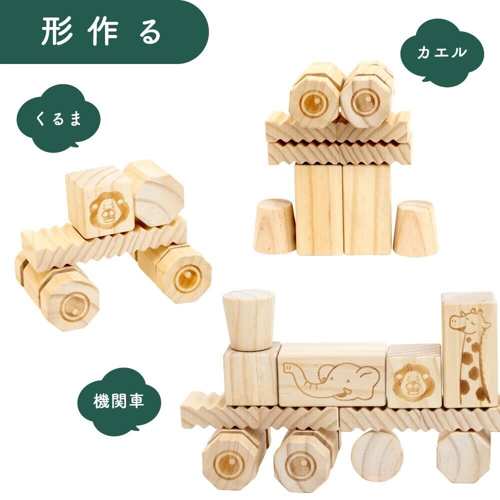 【内容物】うさぎx2、パンダx2、ライオンx2、ぞうx1、キリンx1、カタカタラトルx2、台形x2、八角柱x1、波型つみきx2、収納木箱x1