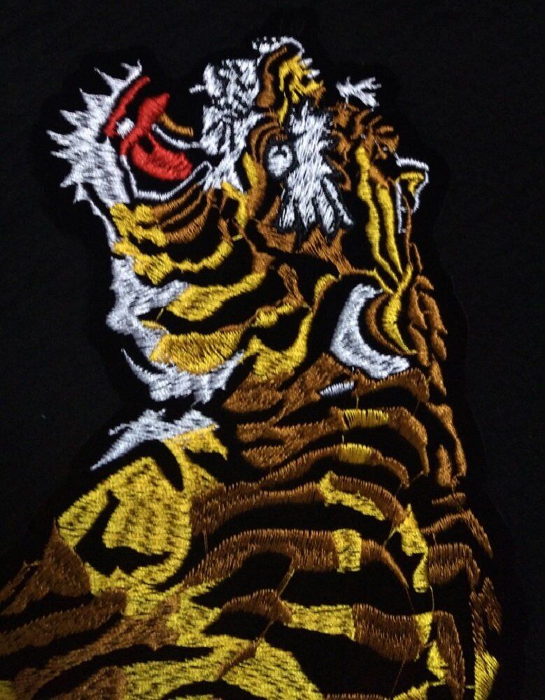 背中にドーーン!!と。大迫力の虎ワッペンです。前向きと後向きとの2枚セットなので、ペアでご使用されてもいいですね。