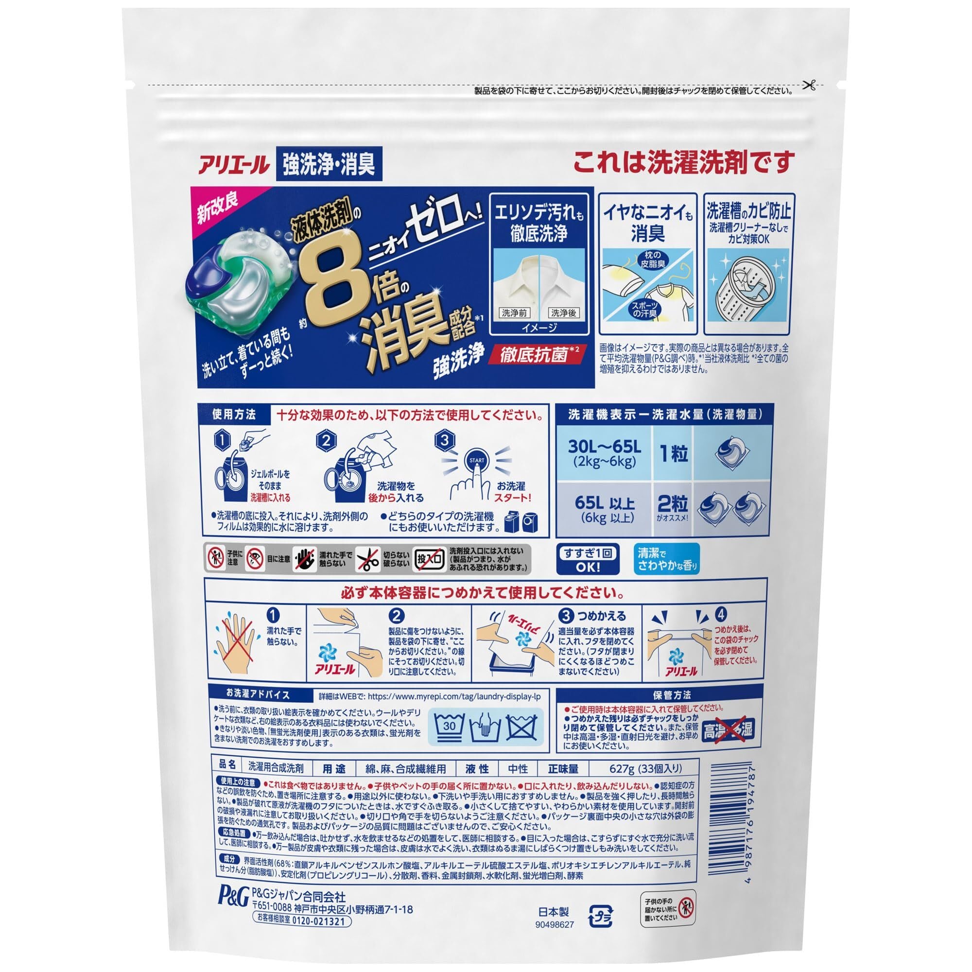 *1 当社液体洗剤比 *2 全ての菌の増殖を抑えるわけではありません。 *3 P&G調べ。汚れの度合いにより、汚れ落ちの程度は異なります。
