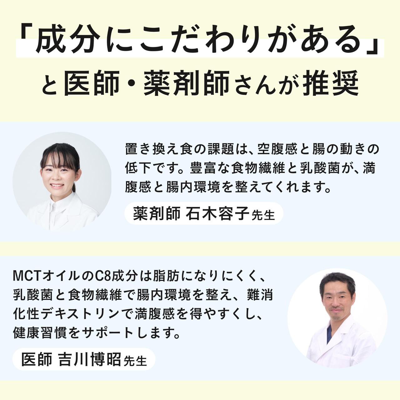 【置き換えサポート成分配合】 イヌリンや難消化性デキストリンなど、豊富な食物繊維に加え、膨らんで満腹感を与えるサイリウムを配合。食事制限で腸の働きが鈍りがちになるところを、3種の食物繊維と乳酸菌がしっかりサポートし、腸内環境を整えながらダイエットをサポートします。