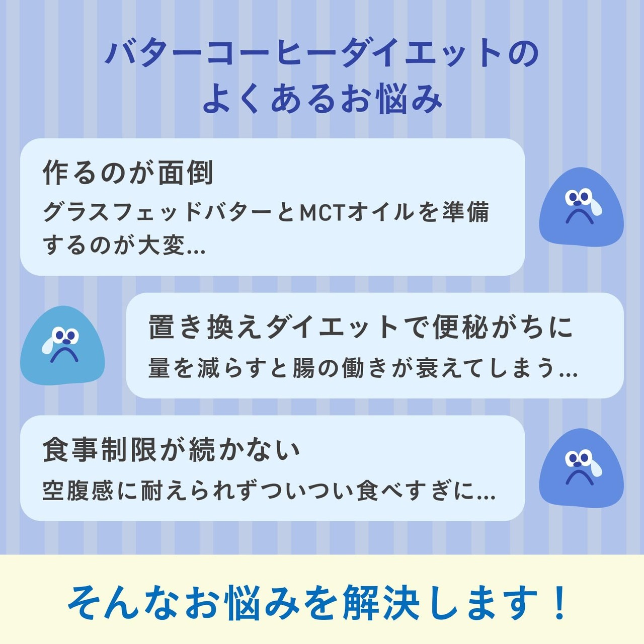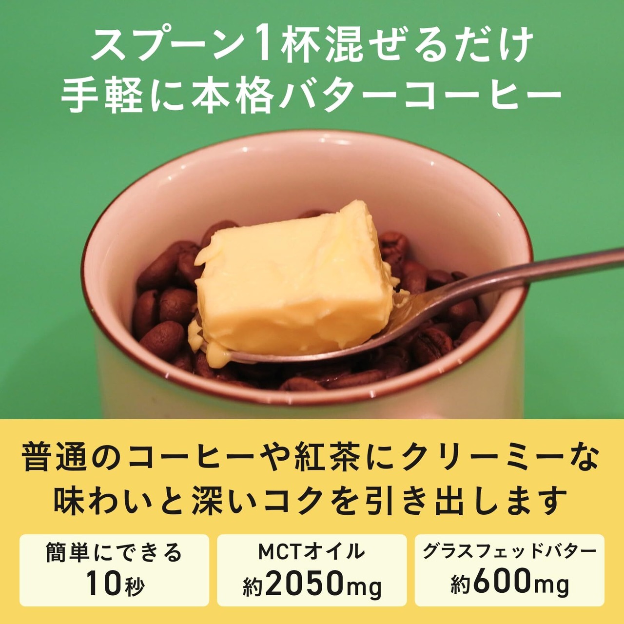 【バターコーヒーで良質な脂質をチャージ】 1回分にMCTオイル約2050mg、グラスフェッドバター約600mg、ギー約400mgを贅沢に配合。これらの良質な脂質が、バターコーヒーとしてあなたのエネルギー代謝を高め、ダイエットを力強くサポートします。
