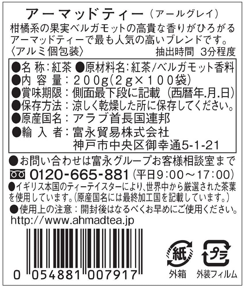 アーマッドティー アールグレイ ティーバッグ 100袋 個包装 大容量 業務用 イギリス 有名 ブランド 紅茶 カフェ AHMAD TEA