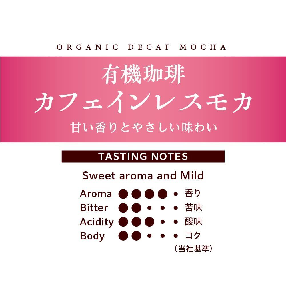 <味わい>甘い香りとやさしい味わい。カフェインレスコーヒー。このカフェインレスコーヒーは、水を用いてコーヒーの生豆からカフェインを97%以上カットしました。