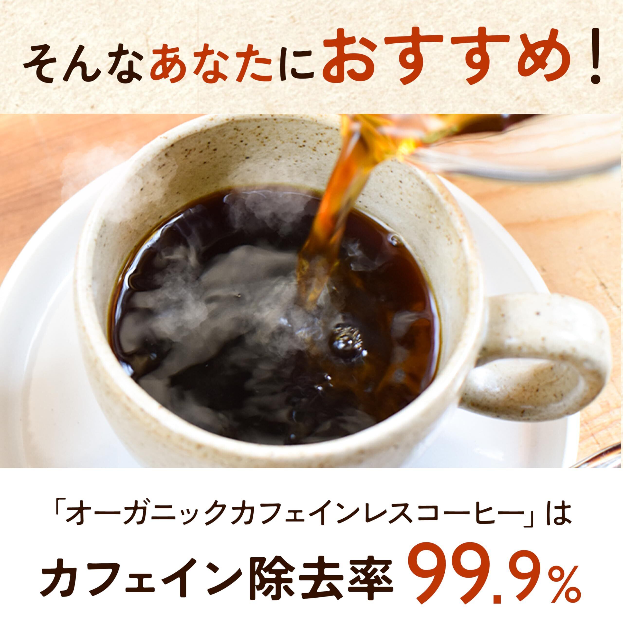 【有機JAS認定のカフェインレスコーヒー】 コーヒーが好きなのに、カフェインを控えなければならない。 寝る前のリラックスタイムに飲みたい。そんな方に。 有機焙煎コーヒーから99.9%のカフェインをカット。 安心・安全な有機JAS認定のオーガニック豆を使用しているので、 小さなお子様や妊娠中・授乳中に方にも安心してお飲みいただけます。