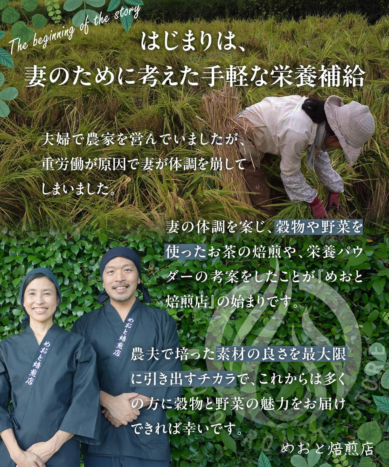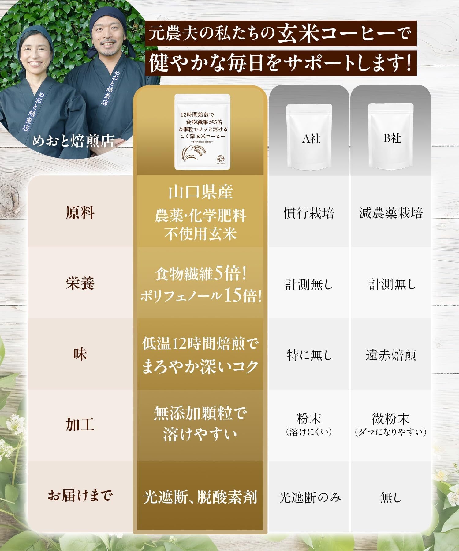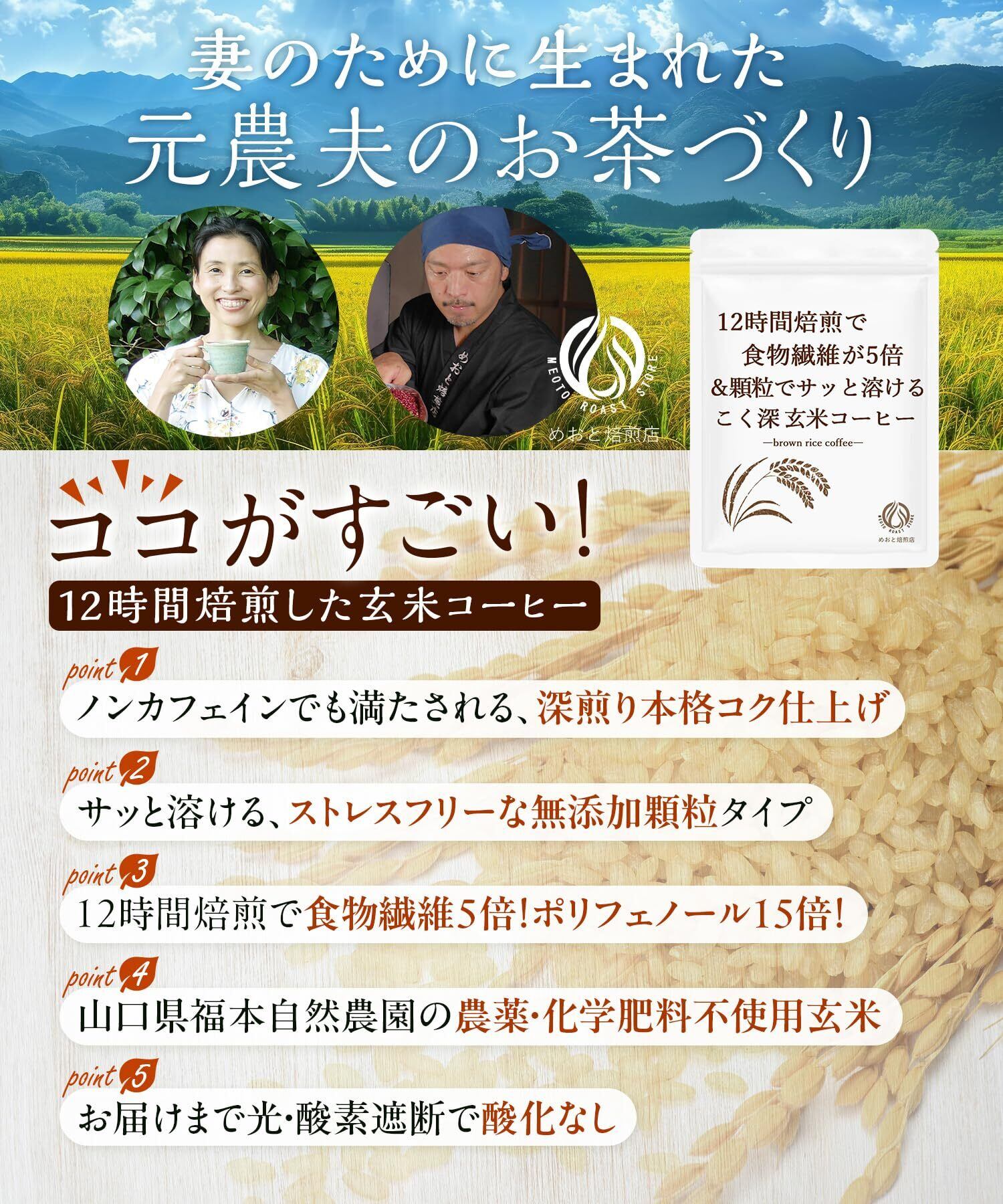 原料は100%農薬・化学肥料不使用無農薬で栽培された玄米を原料に100%使用し、12時間以上焙煎することで食物繊維が豊富な玄米珈琲に仕上げました。