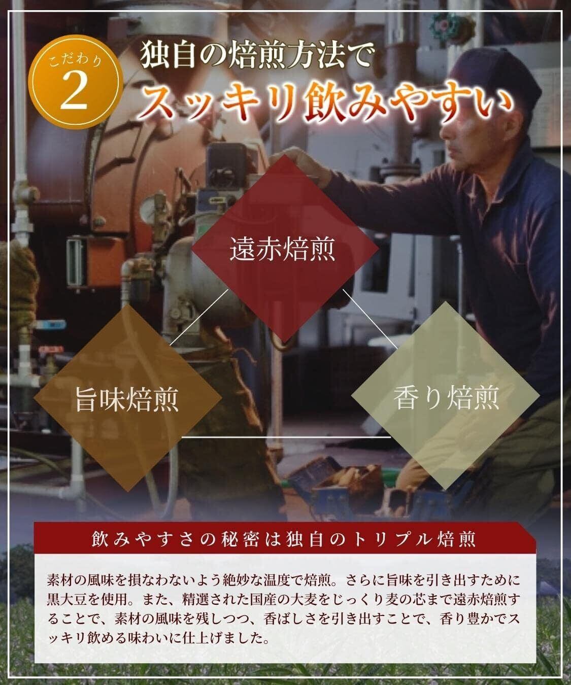 【独自のトリプル焙煎製法】 黒ごま・大麦・黒大豆それぞれの特長を引き出すこだわりの三段階焙煎を採用。お茶の大福園で培われた焙煎技術により、素材を丁寧に深煎りすることで抜群の香ばしさとコクを実現しています。トリプル焙煎が生む香り豊かな薫ばしさは、本品最大の魅力で一杯のお茶から豊かな風味が広がります。