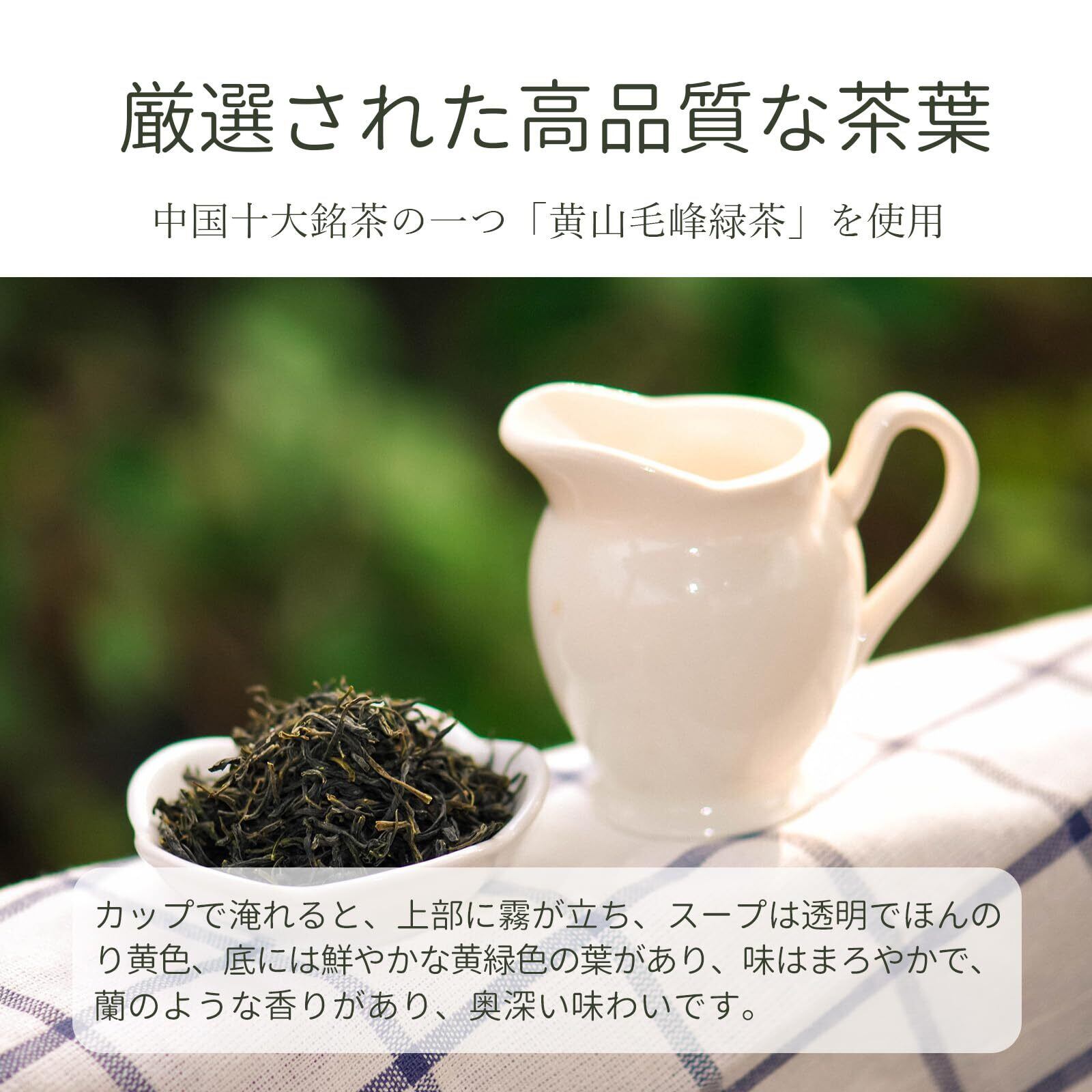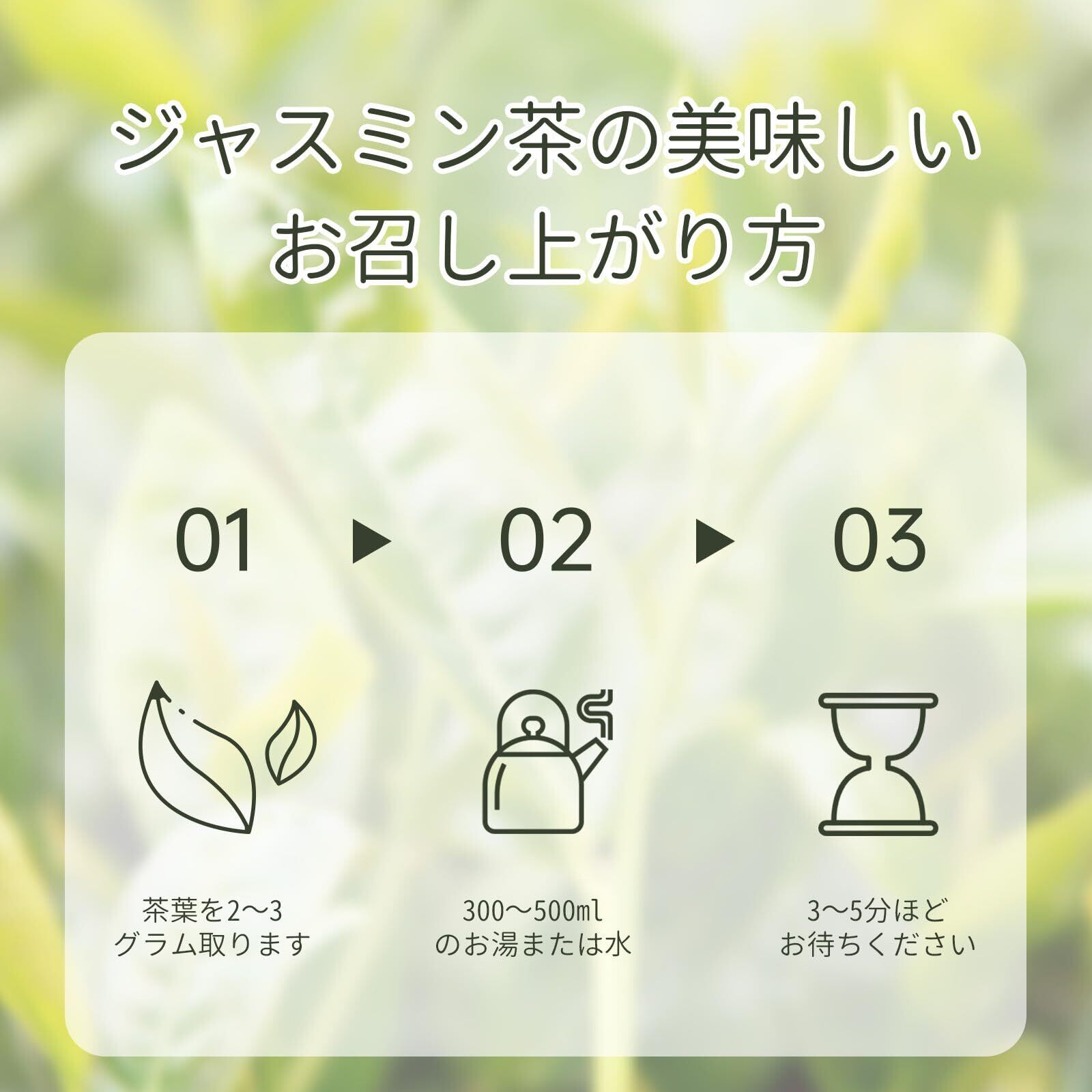 この緑茶の味はさわやかで飲みやすく、ほんのり甘いまろやかな味わいで、友達とのお茶会にもぴったりです。食事とも相性のよいお茶です。茶葉の劣化を防ぐため、仕上げに花を丁寧に取り除きます。また、保管に便利なチャック付きの袋に入っています。
