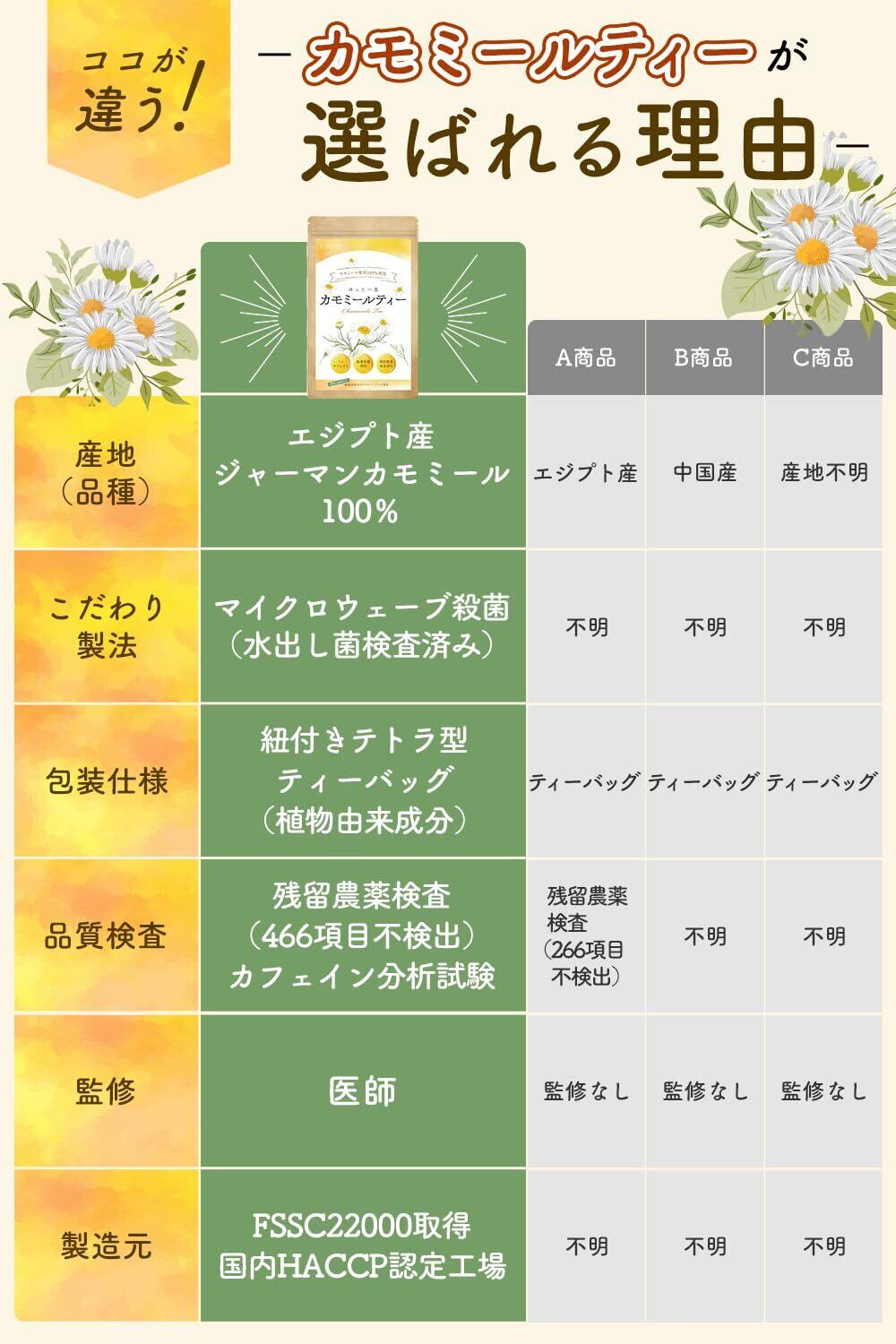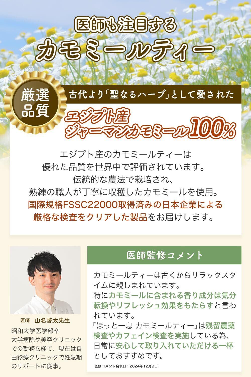 【エジプト産・ジャーマンカモミール100%使用】世界で評価される高品質・エジプト産ジャーマンカモミールを100%使用。国際規格FSSC22000取得の日本企業が選別したカモミールティーをお届けします。