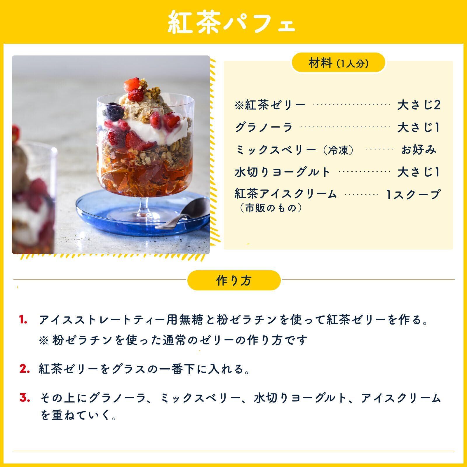 【氷をいれたグラスに注ぐだけ】氷をいれたグラスに注いでお召し上がりください。お好みでレモンやミルクを加えてください。フルーツやシロップを入れたアレンジメニューも、見た目も華やかで適しています。