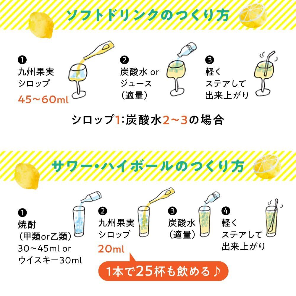 九州果実シロップシリーズのお召し上がり方法:約3倍のお水や炭酸水で割ってお召し上がりください。ハイボールや酎ハイ、カクテルの割り材としてお使いいただけます。 保存方法:直射日光を避け常温で保管。開栓後は【要冷蔵】で保管し、お早めにお召し上がり下さい。