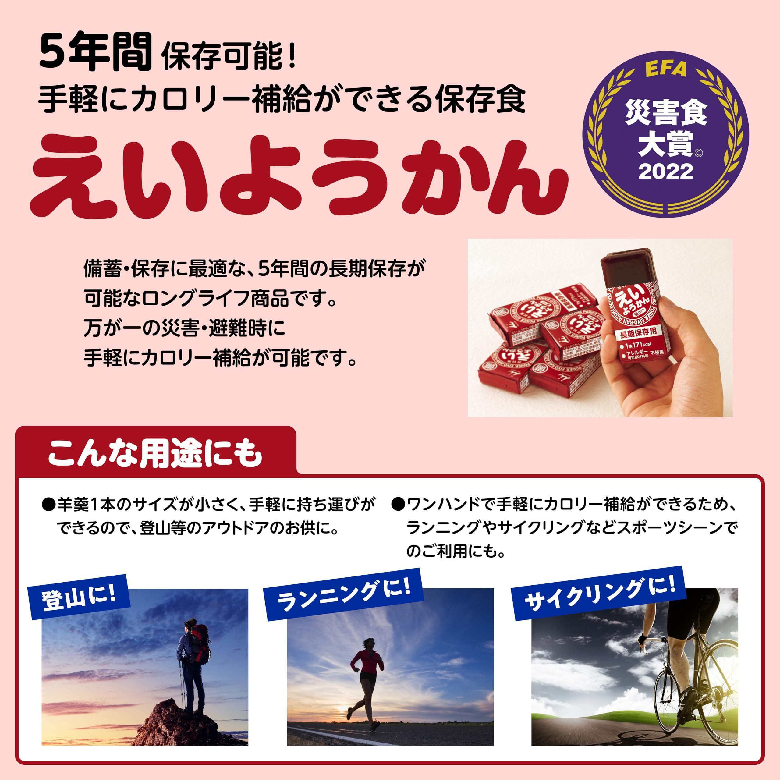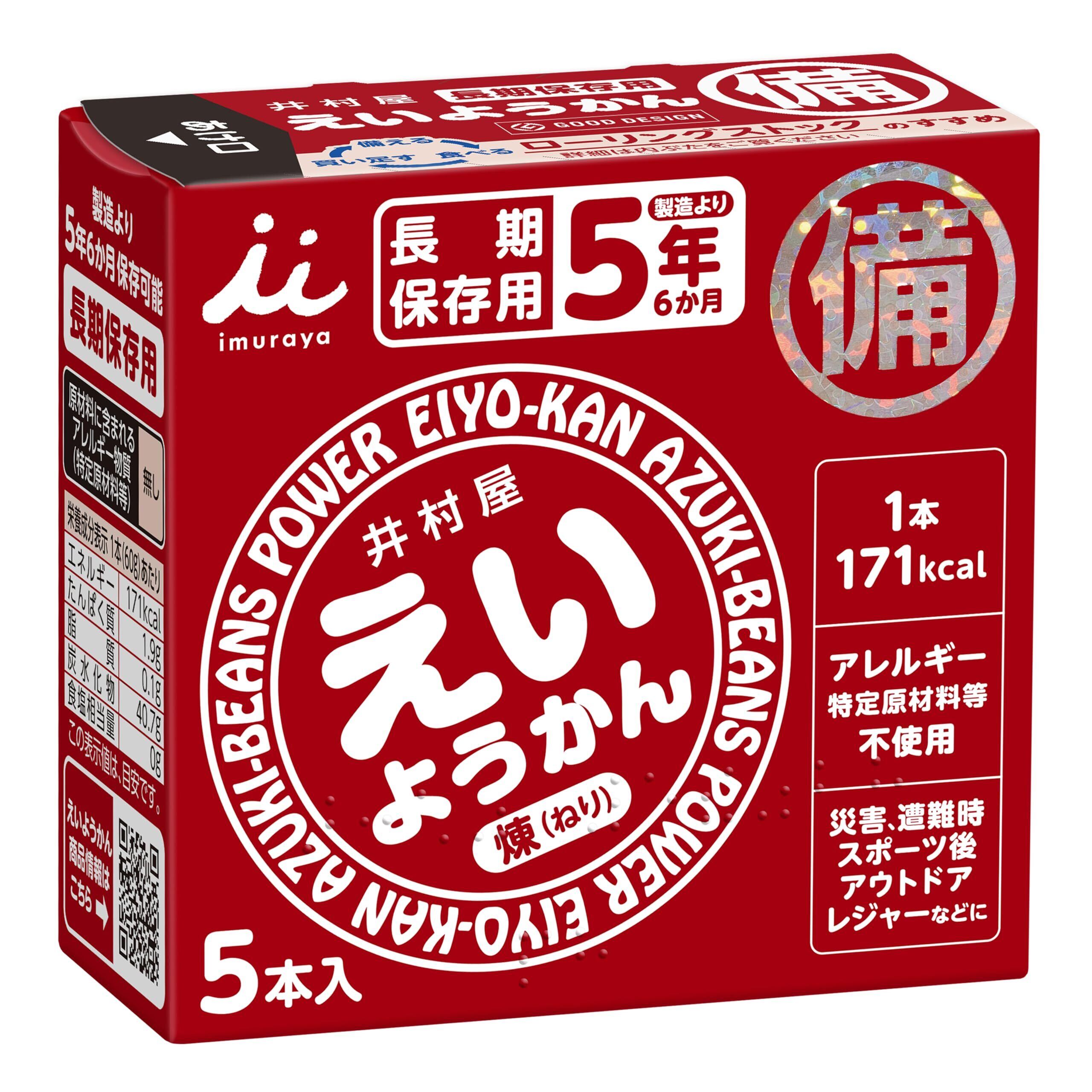 長期保存可能(賞味期限設定5年)で手軽にカロリー補給が出来ます。(一本でご飯一杯分)万が一の災害時・避難時に適した備蓄・保存用ようかんです。アレルギー物質(特定原材料等)を含む原料不使用で多くの方に配布する会社や公共施設の備蓄に適しています。 災害時などハサミがない時でも手で簡単に開けて食べられます。 原材料:砂糖(国内製造)生あん(小豆)水あめ寒天 栄養成分 1本(60g)当たり/エネルギー171kcal ・暗闇で見つけやすいホログラム付き ・パッケージに点字付き ・災害用伝言ダイヤル案内 ・防災袋に入れやすいサイズ