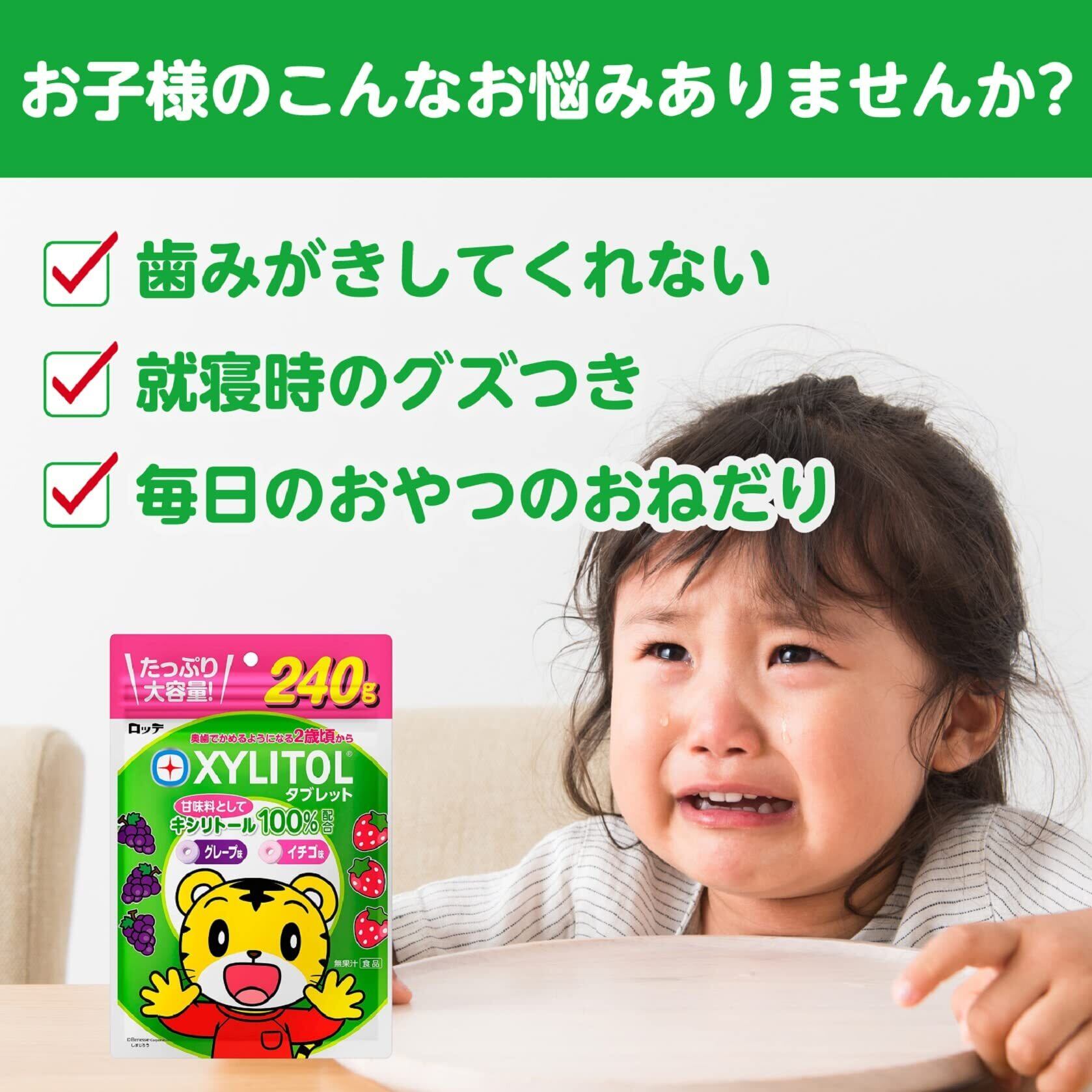 キシリトールが甘味料中100%配合されているタブレットで、人気のグレープ味とイチゴ味の2種類の味が楽しめます。2種類の味を選びながら食べられますので、楽しみながらキシリトールを続けられます。子供が食べやすい穴あきタイプのタブレットです。大人気商品キシリトールタブレット史上最大容量の240g入りです。歯みがきのご褒美としても食べて頂けます。