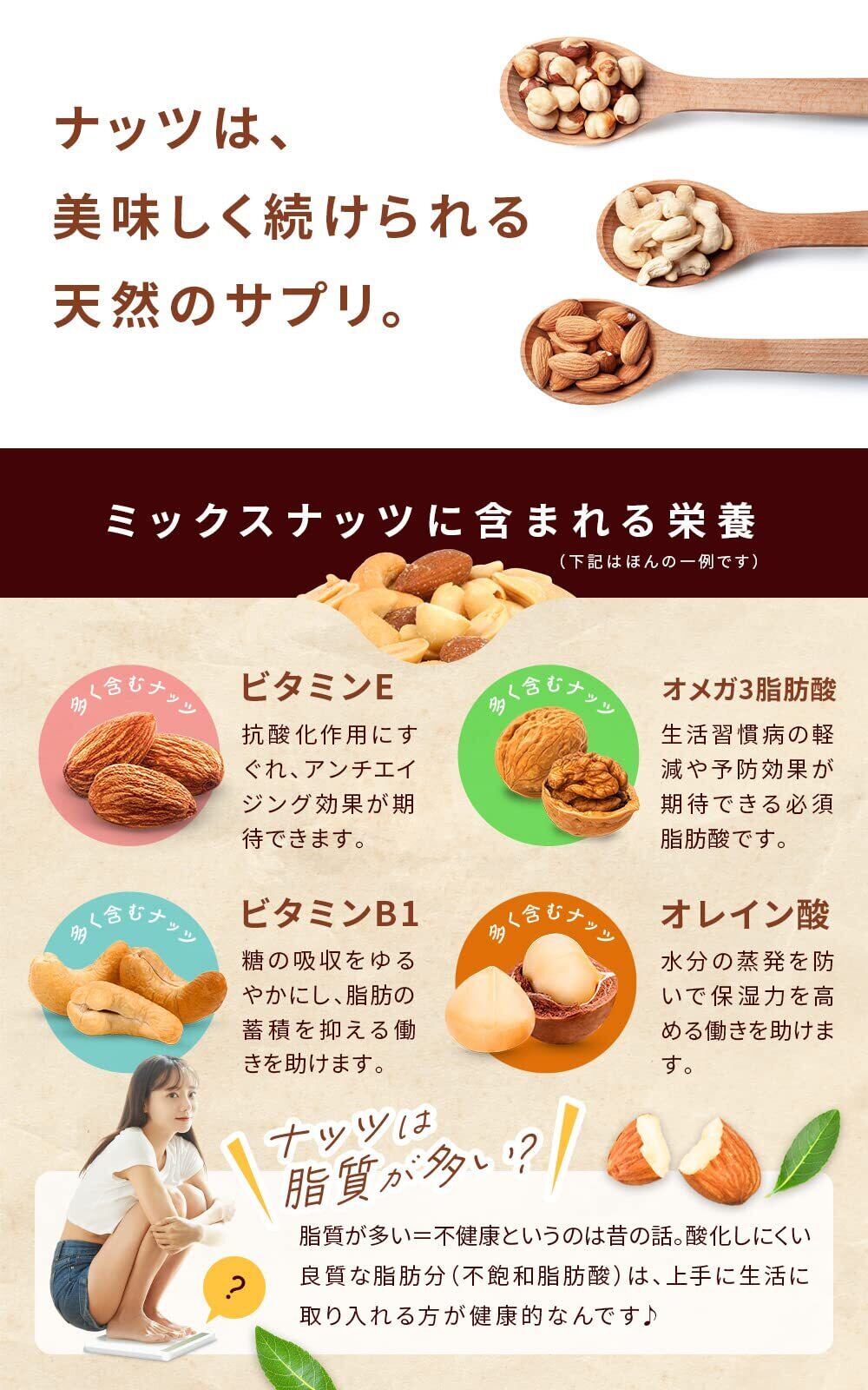 原材料:アーモンド(アメリカ産)・カシュー(インド産)・クルミ(アメリカ産)・マカダミアンナッツ(アメリカ・オーストラリア産)