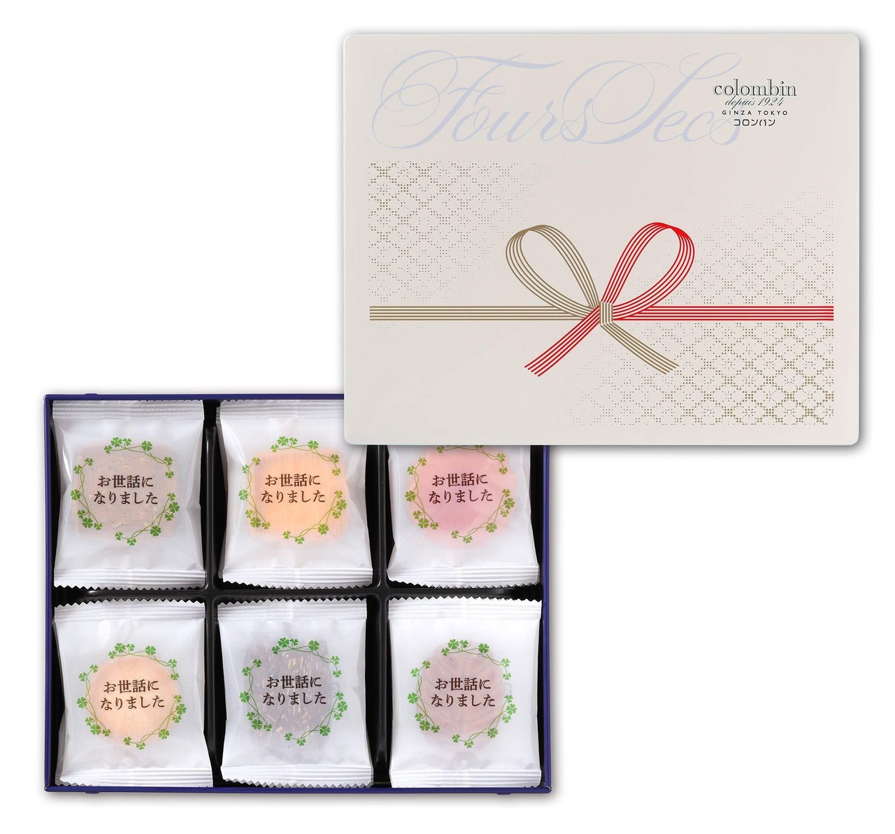 コロンバンが選び抜いた濃厚な味わいのバターをたっぷりと使用した贅沢な焼き菓子「フールセック」の個包装に「お世話になりました」のメッセージをプリントしたデザインのクッキー詰め合わせです。退職、異動、卒業等のシーンに、感謝の気持ちを込めた贈り物としてご活用いただけます。「が発送」の場合、(手提げ袋なし)になります。