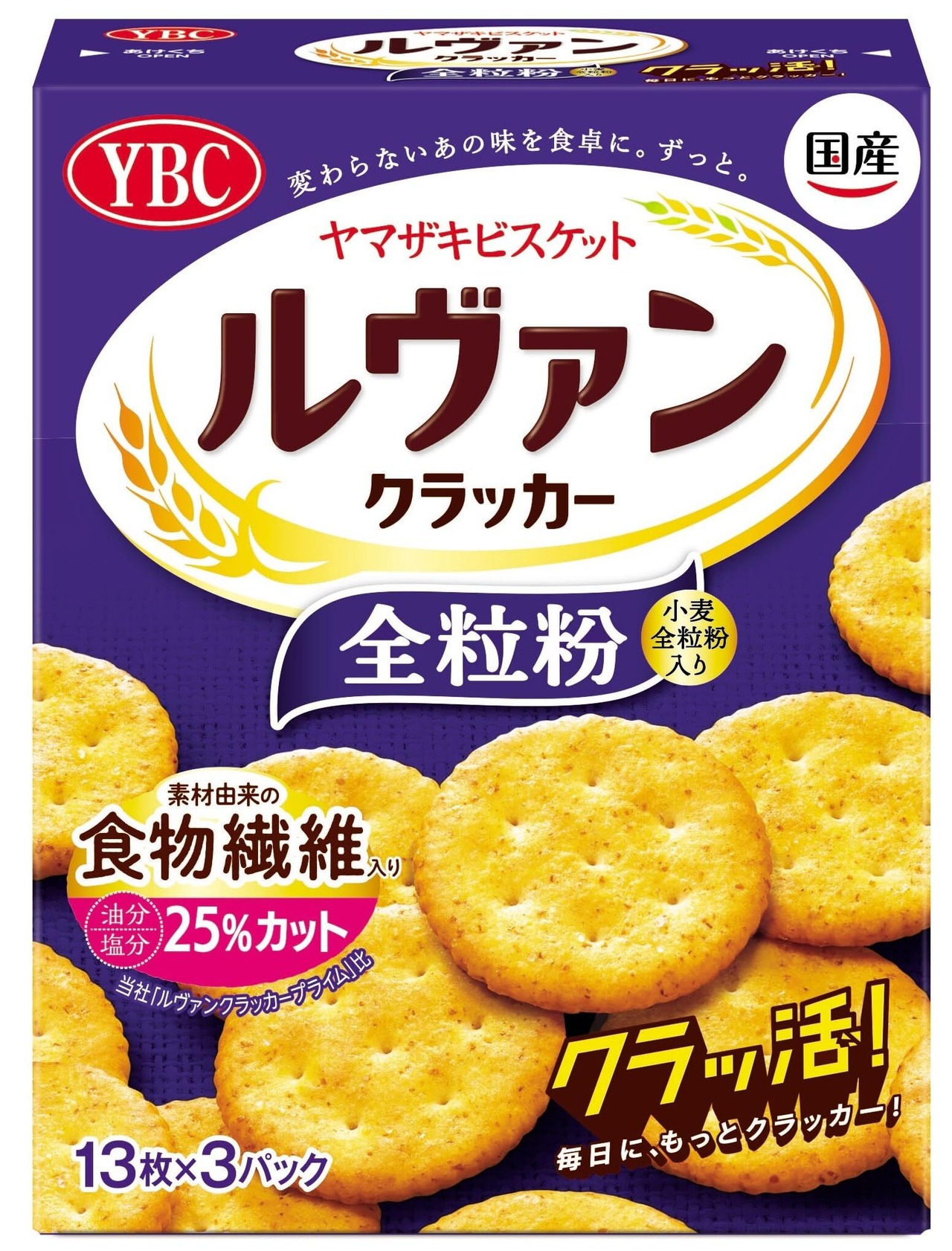 健康意識の高いクラッカー購買層に向けて、素材と健康を意識した小麦全粒粉を使用したクラッカーです。全粒粉に期待する要素である「食物繊維」と「鉄、ビタミン」が摂取できます。また、全粒粉の不満点となる食べにくさ(ボソボソ感)を解消し、おいしさにこだわりつつ、油分と塩分はプライムに比べ25%低減しました。青を基調としたパッケージデザインを採用し、プライムとの陳列効果を高めます。