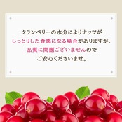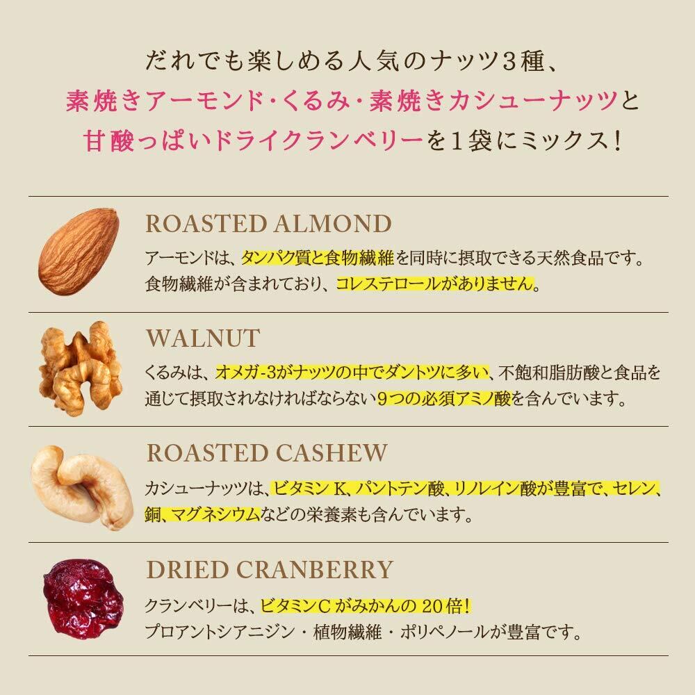 ● 原材料名:アーモンド(アメリカ産)、くるみ、カシューナッツ、乾燥クランベリー(クランベリー、砂糖、植物油脂)。(アーモンド、カシューナッツは焙煎、くるみは生。) ● 栄養成分表示: (100g当たり) エネルギー 629kcal / たんぱく質 13.7g / 脂質61.2g / 炭水化物 17g / ナトリウム 0mg ● 賞味期限:枠外表面右部に記載