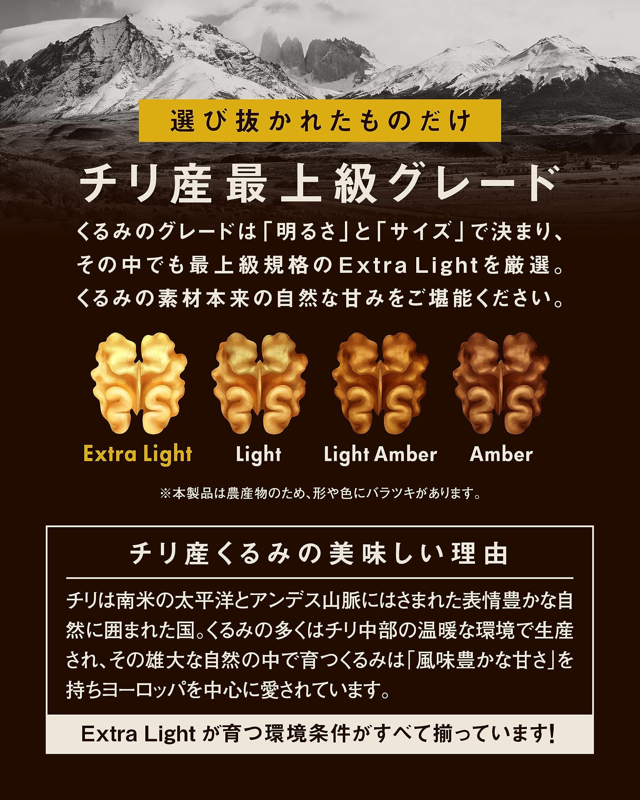 チリ産最上級グレード「ExtraLight」くるみのグレードは「明るさ」と「サイズ」で決まり、その中でも最上級規格にあたるのが「ExtraLight」となります。本商品はそんな「ExtraLight」のみを厳選し、現地から直輸入している為、鮮度抜群でお届けします。