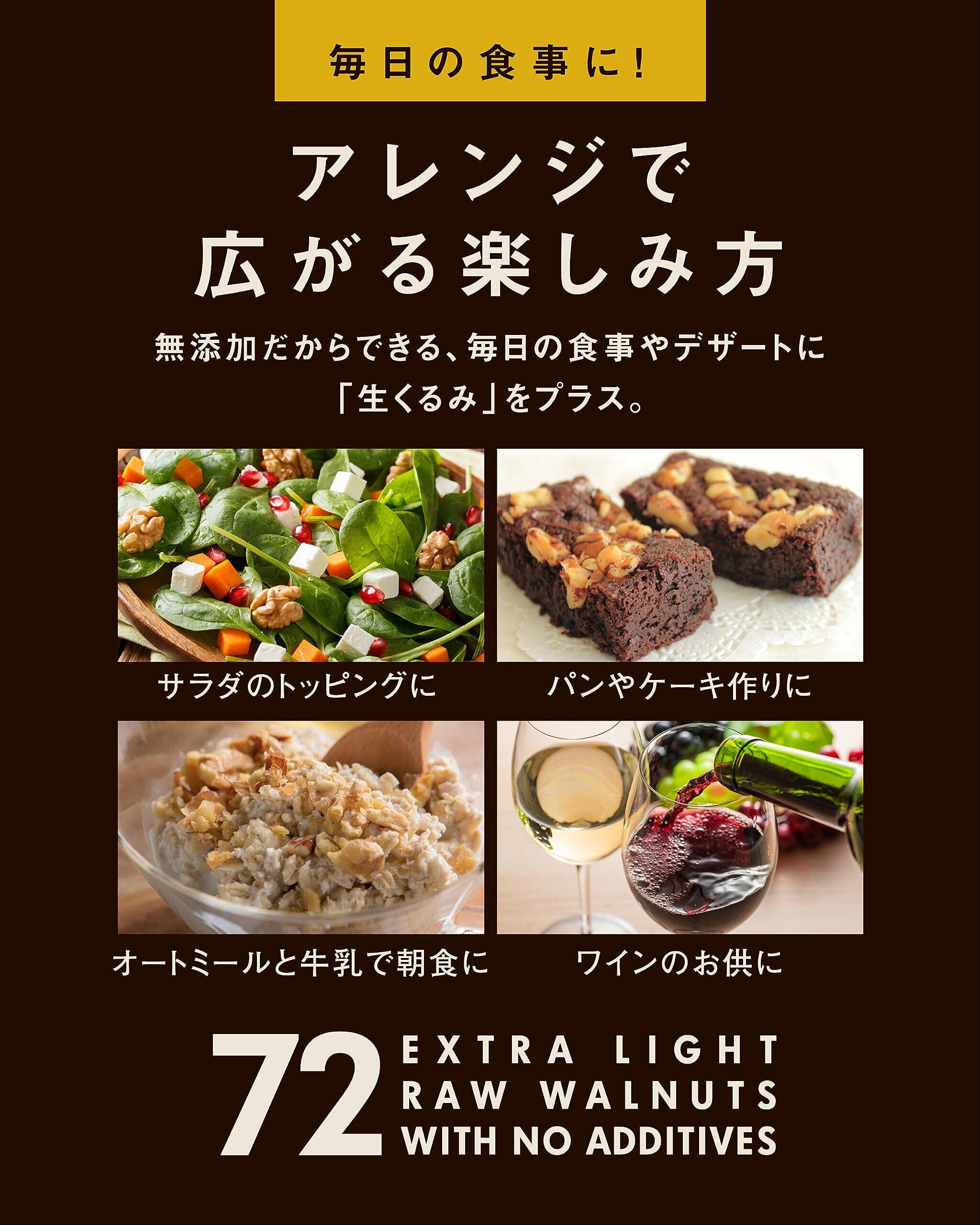 アレンジで広がる楽しみ方火を加えていない「生くるみ」なので、お料理からデザートまでアレンジの幅は無限大!もちろん「ExtraLight」特有の芳醇な香りはワインや日本酒などとも相性抜群です。