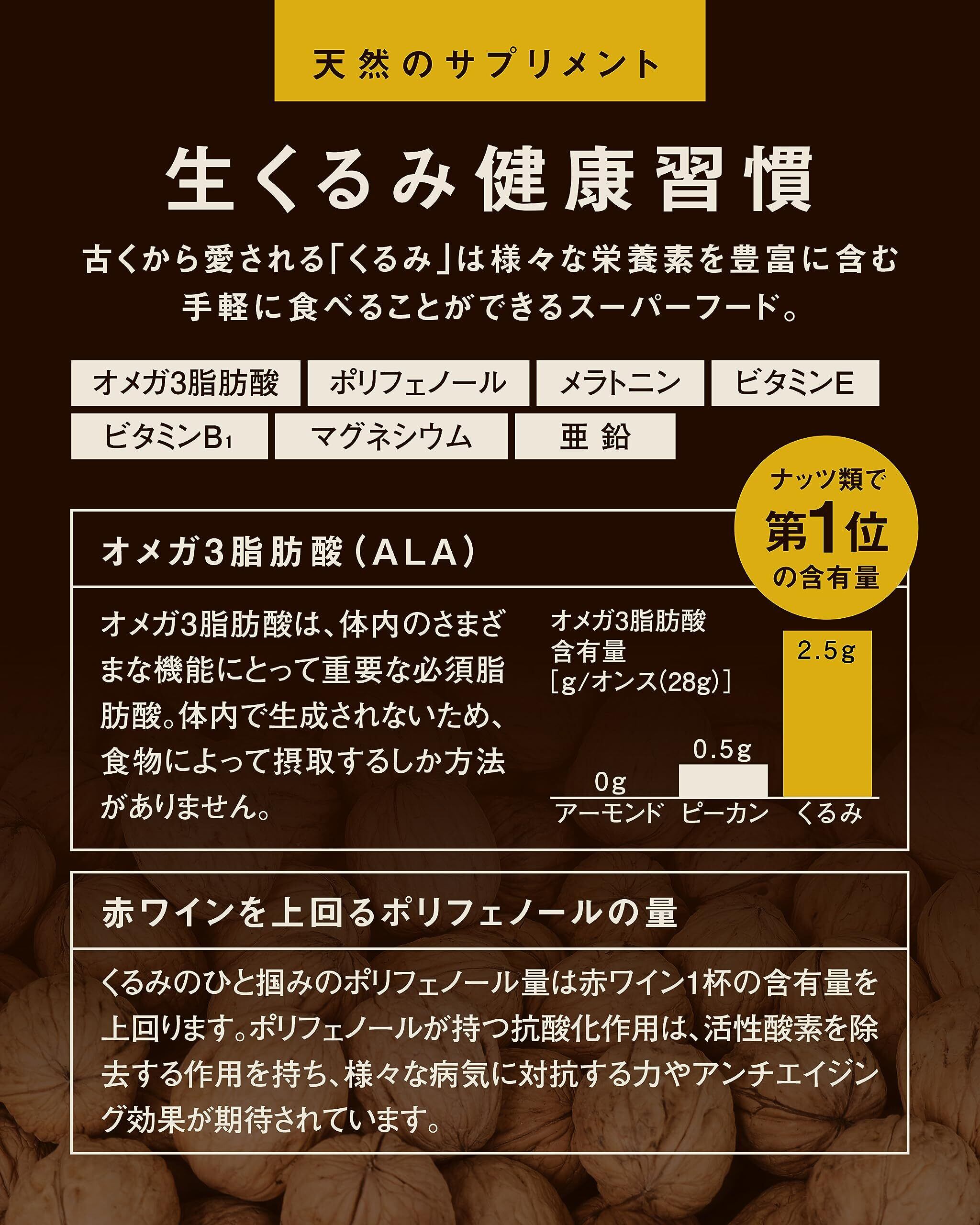 くるみはスーパーフードくるみはナッツ類でダントツ1位の含有量を誇る「オメガ3脂肪酸(ALA)」や、赤ワインを上回る「ポリフェノール」など、豊富な栄養素を含んでいます。その為、世界的な健康や美容への意識の高まりにより、人気が高まっています。
