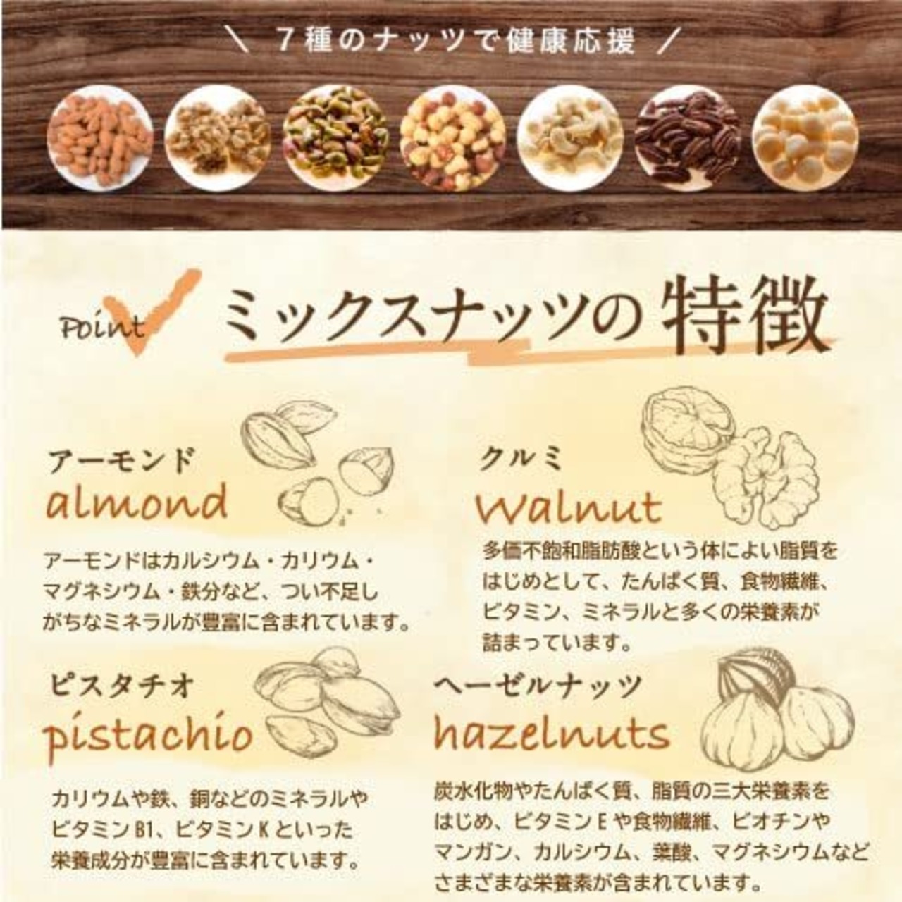 アーモンド、カシューナッツ、クルミ、ピーカンナッツ、ピスタチオ、ヘーゼルナッツ、マカダミアナッツを香ばしく仕上げました。商品の出荷については万全を期していますが、まれに虫食い等の被害豆が混入することがあります。その場合は取り除いてご使用ください。