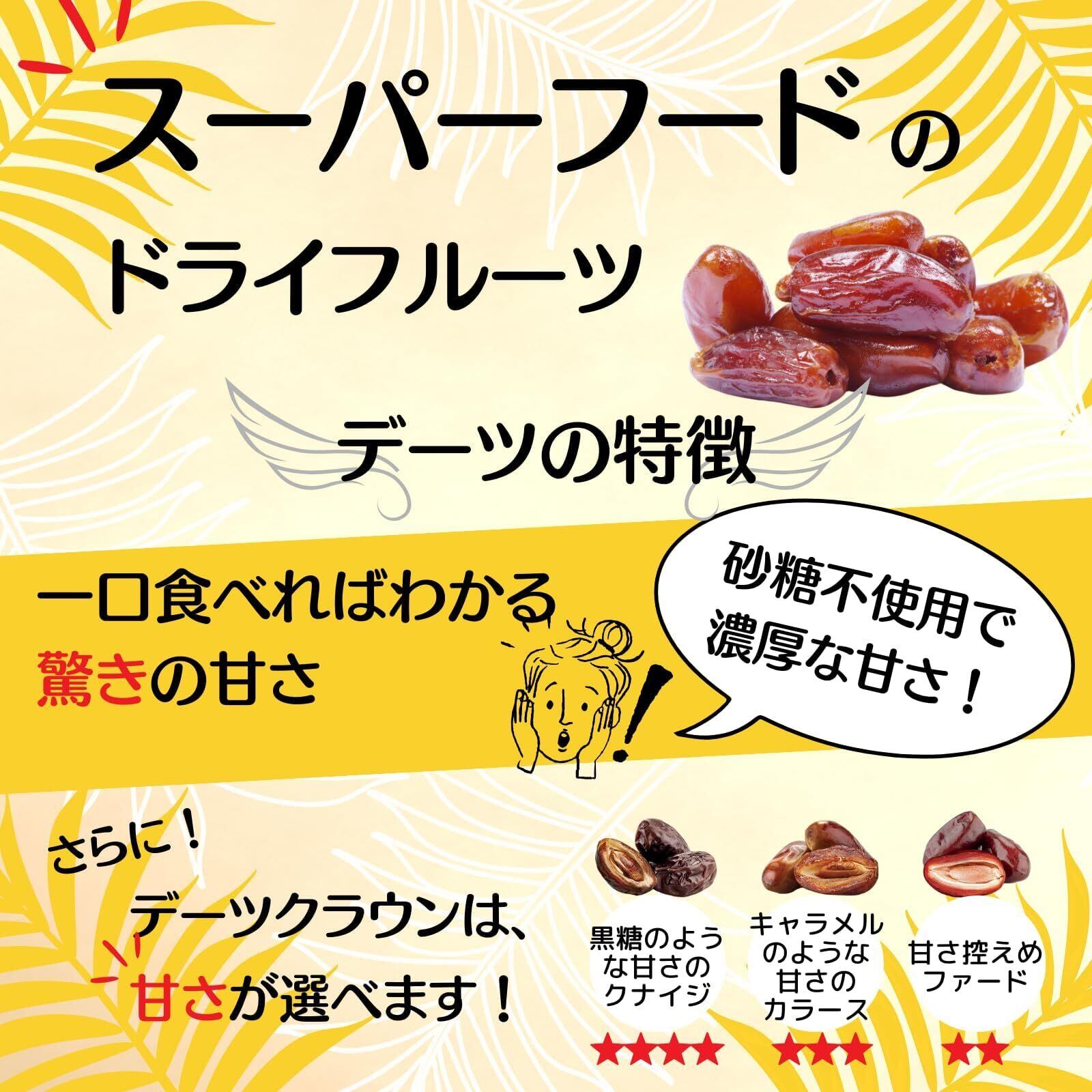 【本来のデーツの味を楽しむ】デーツクラウンのデーツは、種入りです。種抜きは実をカットするため少し硬い食感ですが、デーツクラウンは種入りのためデーツ本来の柔らかさを味わうことができます。本場のデーツを本場の食べ方で、それがデーツクラウンのこだわりです。無添加、砂糖不使用、オイル不使用、非遺伝子組換え、残留農薬検査済(日本)のデーツです。