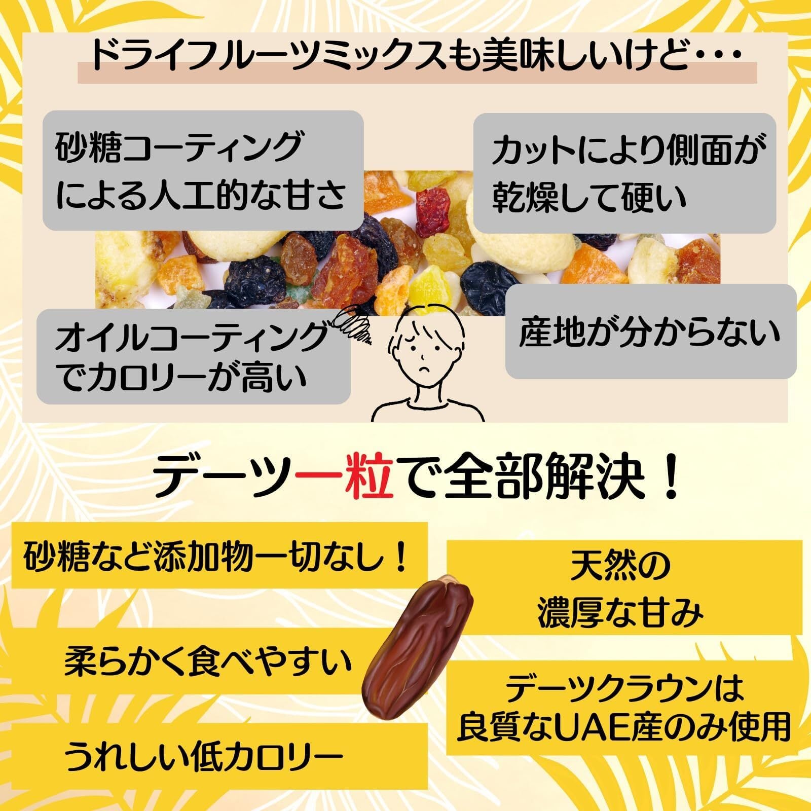 【デーツクラウンのデーツ】デーツの鮮度を保ちデーツ本来の味と食感をお楽しみ頂くために種が入っております。種無しデーツに比べ、ふっくら柔らかく、芳醇な甘さです。無添加・砂糖不使用・非遺伝子組換え・ノンオイル、デーツの粒の大きさも揃えています。