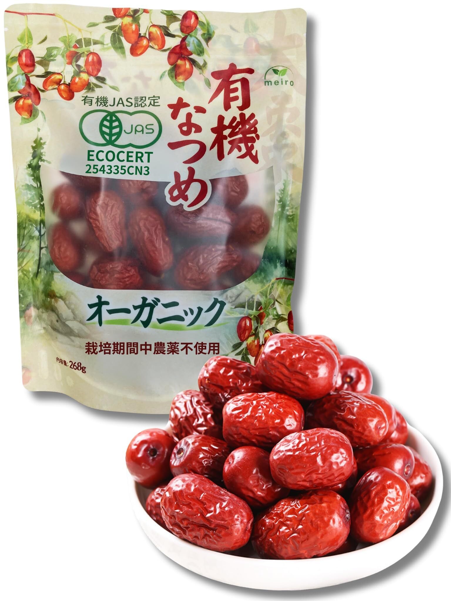meiro 有機なつめ 268g 日本有機認証JAS取得 100%オーガニック 完全無農薬 無添加 棗 デーツ ドライフルーツ 赤い 乾燥なつめ ドライ ナツメ 漢方 薬膳