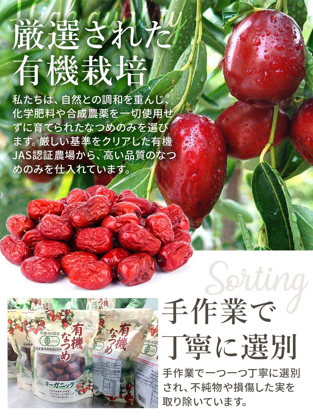 2【100%天然成分】: 当社の有機なつめは100%天然成分のみで構成されており、添加物や保存料は一切使用していません。自然の恵みをそのままお届けすることで、健康と環境に配慮した商品を提供しています。