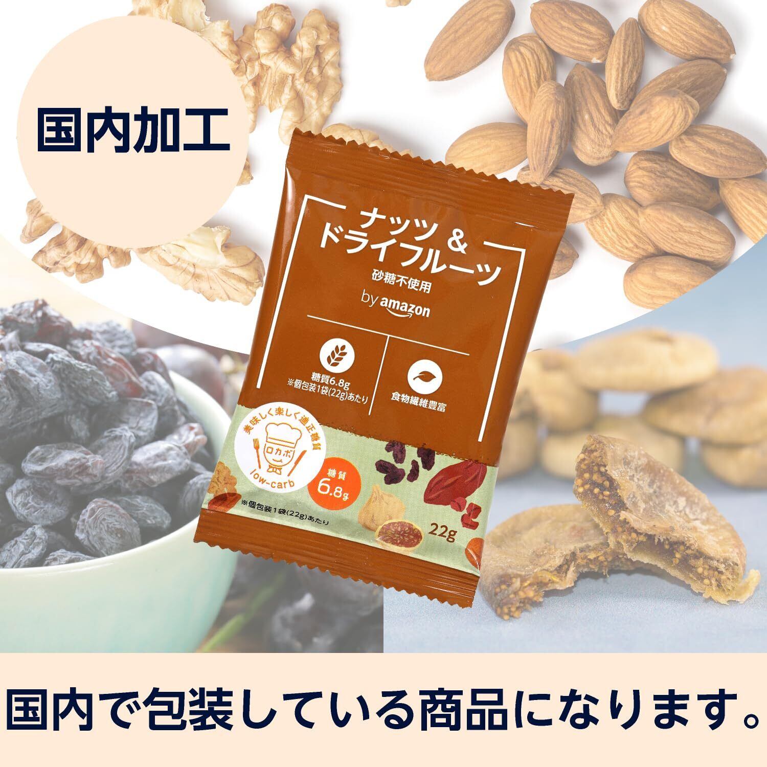 糖質を気にしている人でも食べられる、ロカボなおやつシリーズ。個包装1袋(22g)当たり、糖質6.0gです。 砂糖・食塩不使用、素焼きのアーモンドとクルミにドライフルーツのデーツとレーズン、いちじくをミックスしました。体に良いものを食べたいけど素焼きに飽きてしまったという方に、是非食べていただきたい一品です。 原材料・成分:個包装1袋(22g)当たり エネルギー:120kcal/たんぱく質:3.0g/脂質:8.5g/炭水化物:8.7g/食塩相当量:0.003g/ n-3系脂肪酸:0.81g/糖質:6.8g/食物繊維:1.9g ・袋の角や切り口で怪我をしないようご注意ください。・個包装開封後は密封して冷蔵庫で保管し、早めにお召し上がりください。農産物のため、稀に殻や茎などが入っていることがありますので、ご注意ください。・ドライフルーツの水分によって、ナッツがしっとりとした食感になる場合がありますが、品質には問題ありません。・デーツの表面に付いている粉は米粉です。注意:本品は、5歳以下のお子様には食べさせないでください。口の中にいれたままで走ったり、泣いたりすると誤って気管に入り窒息する危険があります。アレルギー物質(特定原材料等):くるみ・アーモンド 本品製造工場では、えび・小麦・乳成分・落花生を含む製品を生産しています。ごみに出すときは市町村の区分にしたがってください。