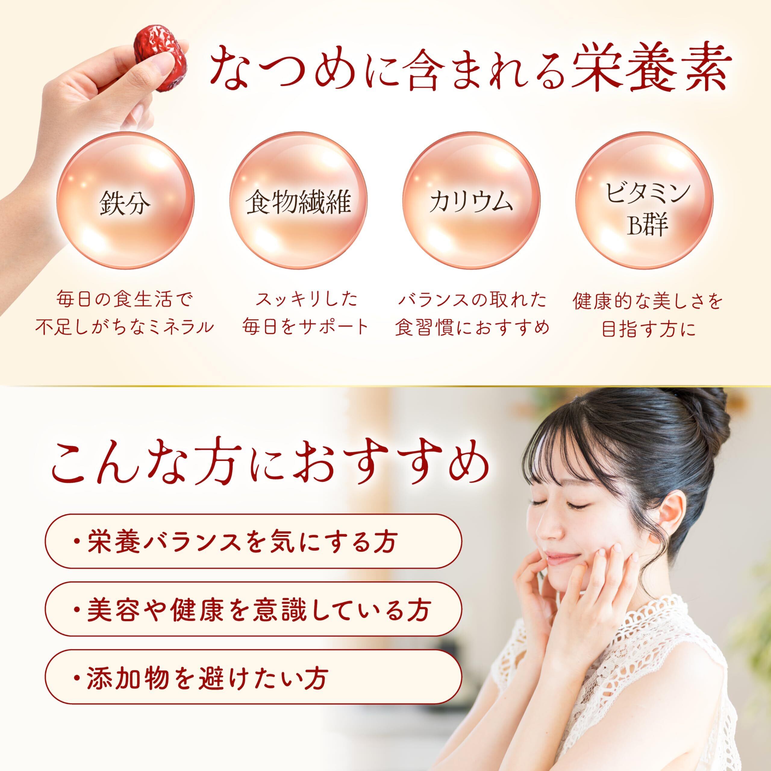 【商品内容】 化学肥料・農薬不使用の大粒なつめを使用したしっとりなつめです。ふわふわ、しっとりとした独自の食感と、黒糖のような自然な甘みが特長。原料生産地は中国(寧夏自治区)です。