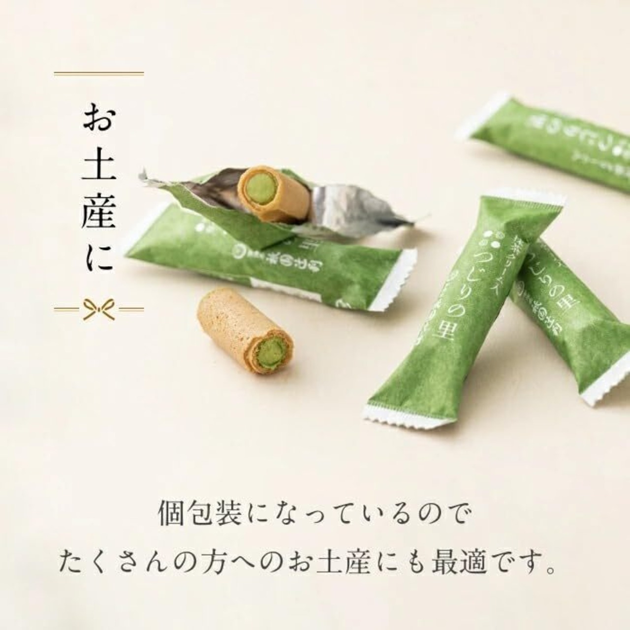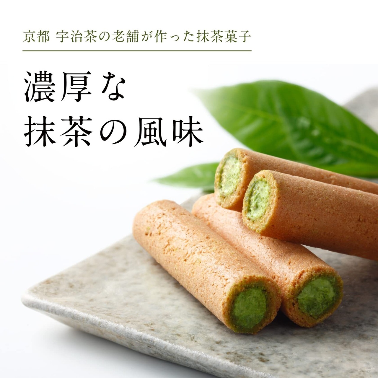 【当店人気No1の抹茶菓子】丁寧に焼いたロールせんべいの中に、抹茶クリームをいれてティータイムに気軽に楽しんでいただけるお菓子に仕上げました。