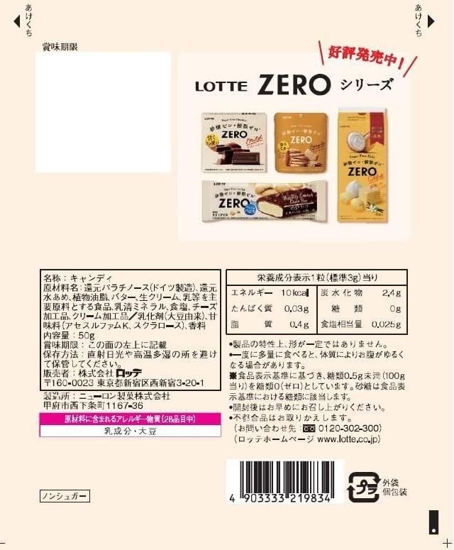 原材料:還元パラチノース(ドイツ製造)、還元水あめ、植物油脂、バター、生クリーム、乳等を主要原料とする食品、乳清ミネラル、食塩、チーズ加工品、クリーム加工品/乳化剤(大豆由来)、甘味料(アセスルファムK、スクラロース)、香料