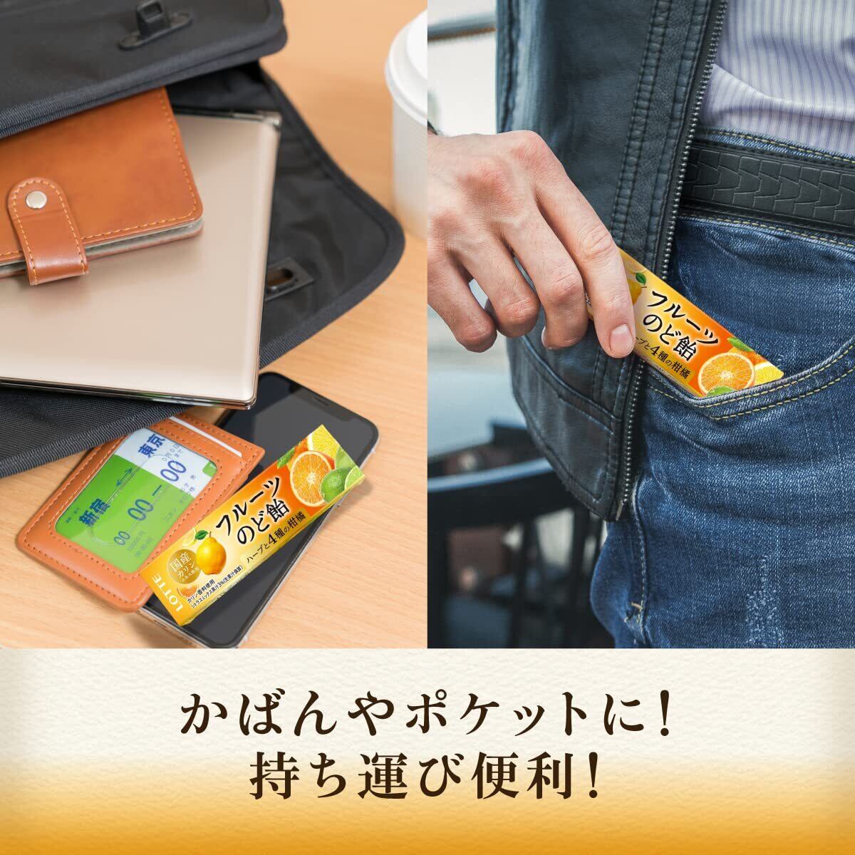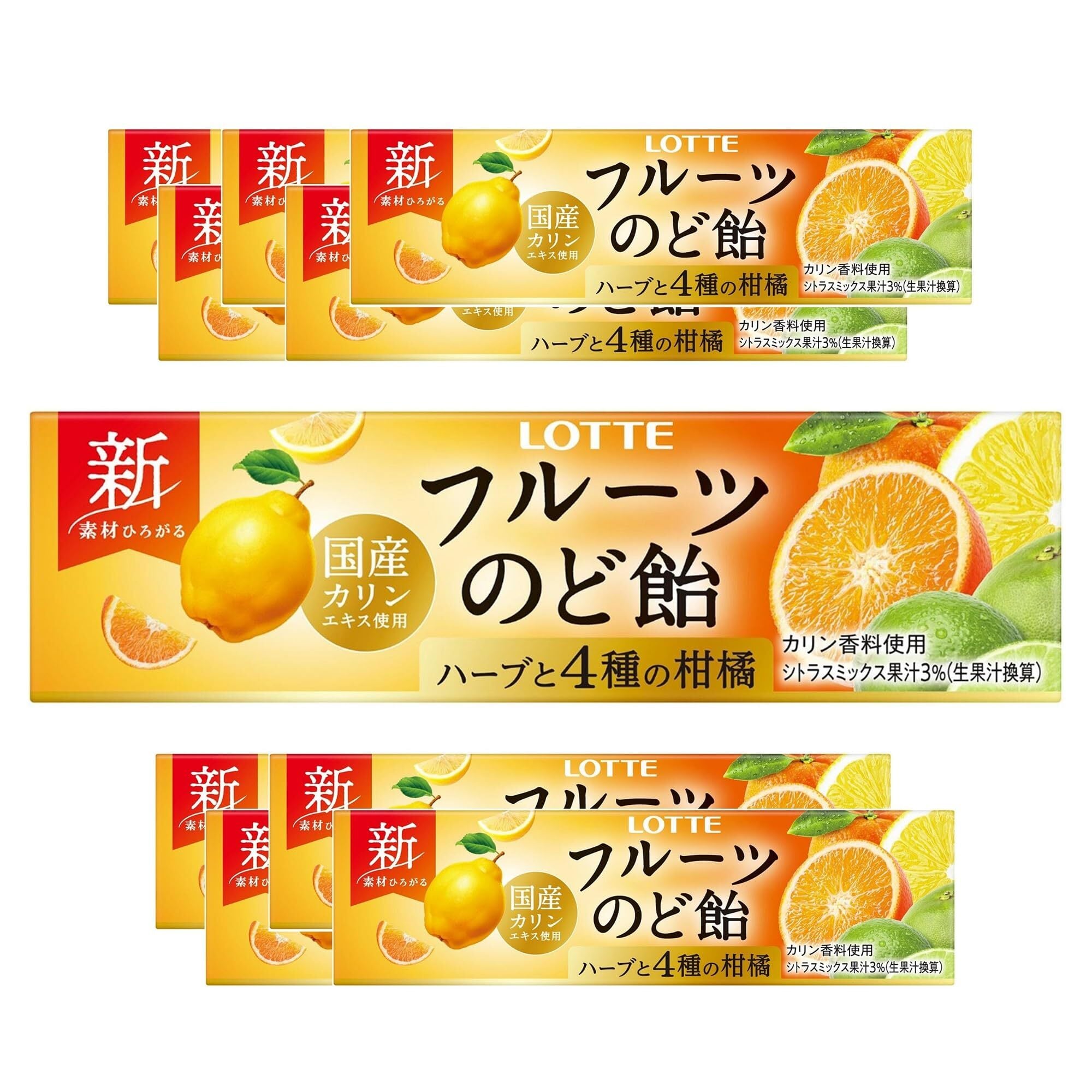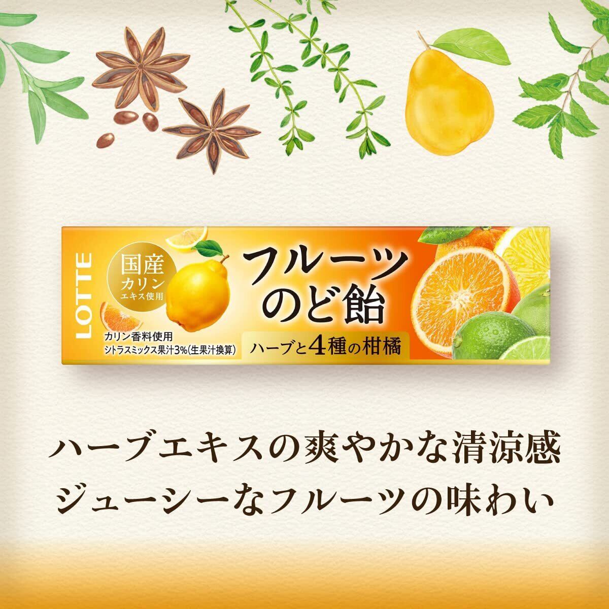 カリンエキスを配合したロッテ「フルーツのど飴」。ビタミンCを配合し、オレンジの爽やかな味わいと心地よい清涼感が口の中に広がりスッキリした気分をもたらしてくれます。カリンとハーブで優しくのどを癒しながら爽やかなオレンジの味わいも楽しめるロッテ「フルーツのど飴」。ビタミンCを配合しているので日頃から身近に備えておくことで、いざという時に自分を守りベストな状態を保つことができます。