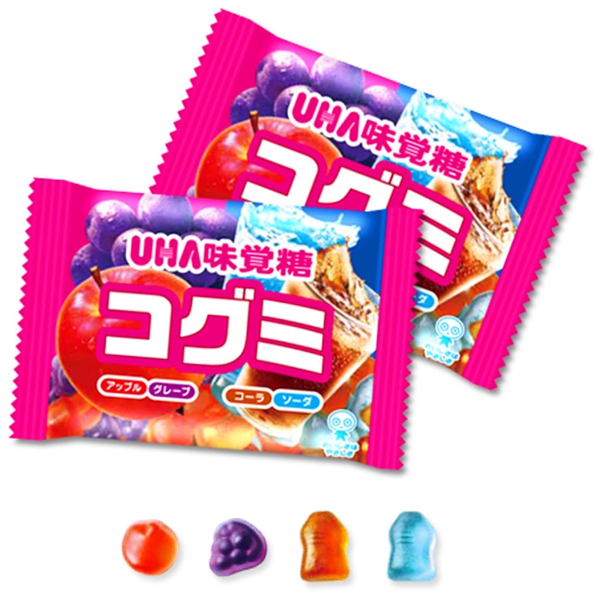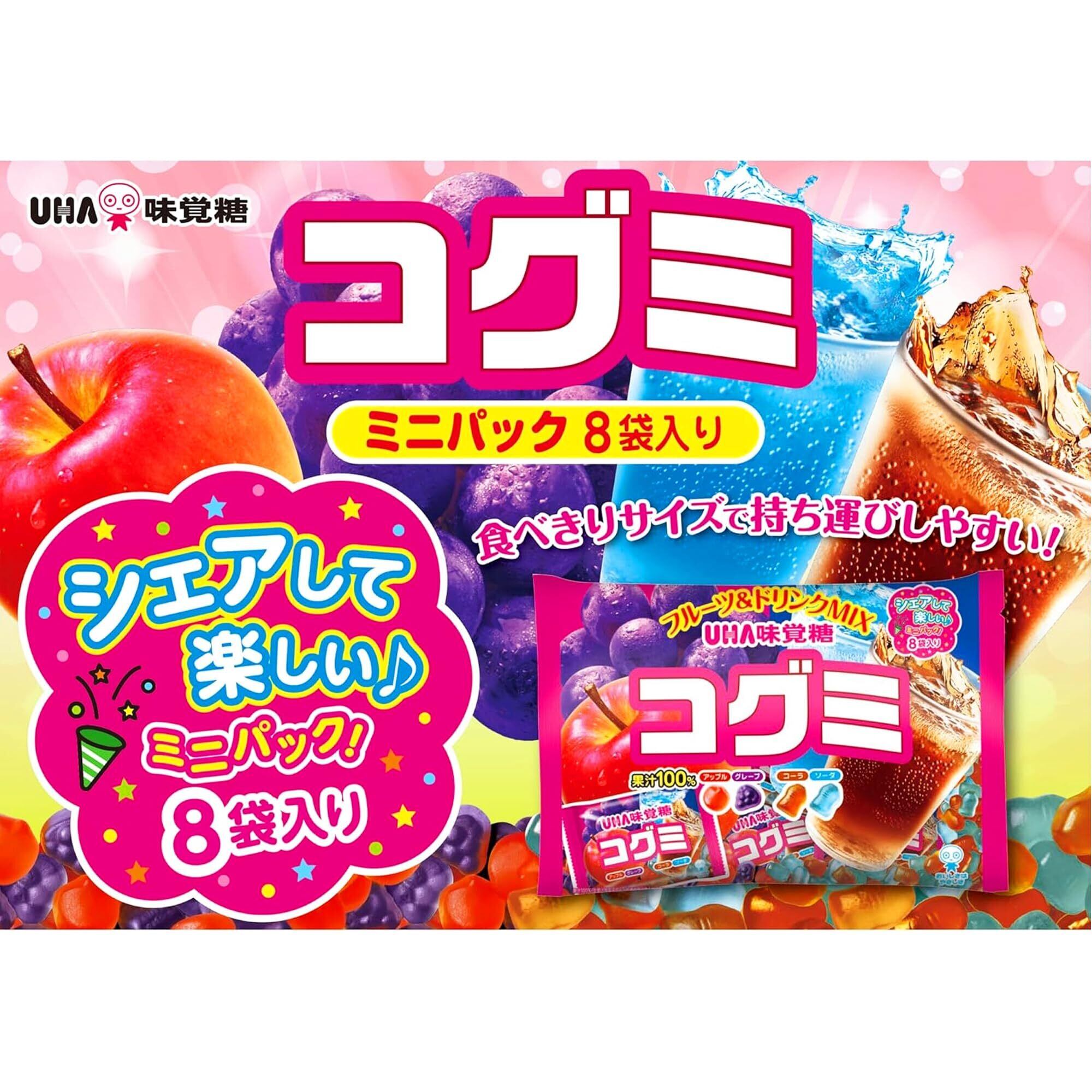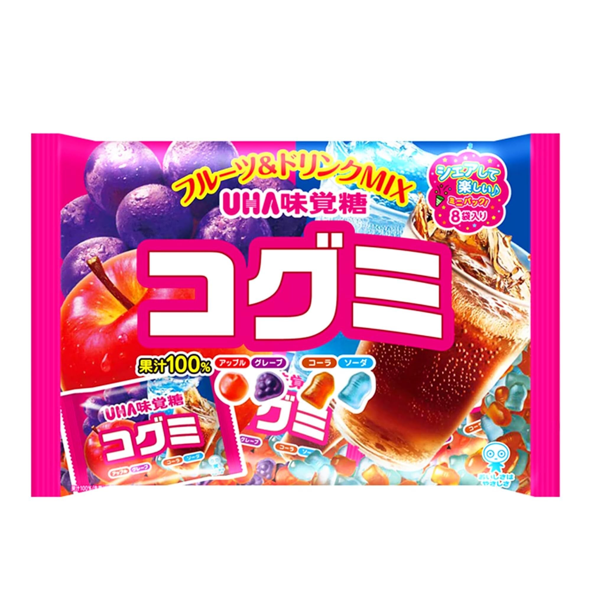 ぷにぷに食感の小粒グミの4種アソート。ミニパックが8袋入ったファミリーパックです。グレープ・アップル・コーラ・ソーダをアソートにしました。